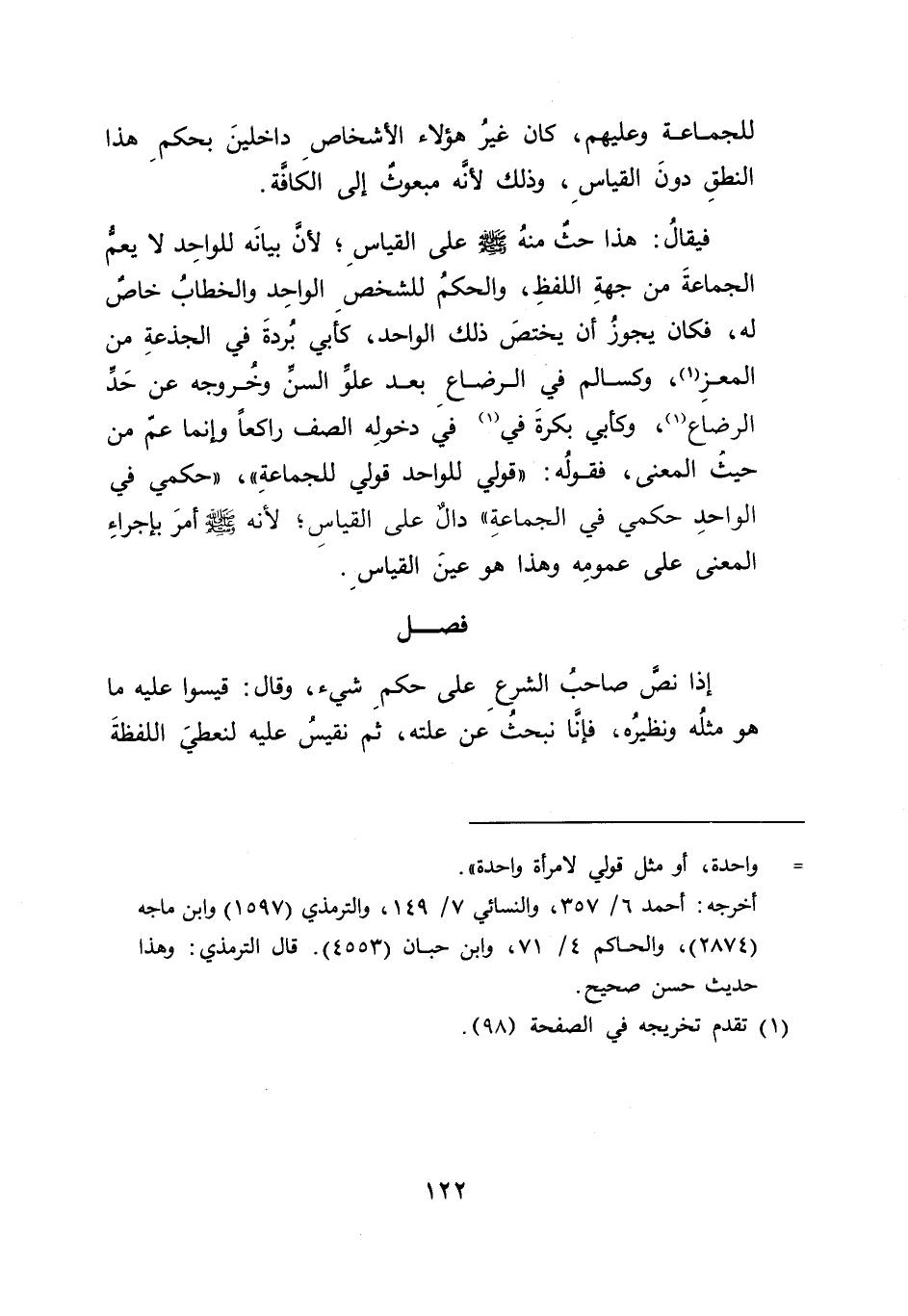 فيقالُ: هذا حثٌ منهُ - صلى الله عليه وسلم - على القياسِ؛ لأنَ بيانَه للواحِد لا يعمُّ الجماعةَ من جهةِ اللفظِ، والحكمُ للشخص الواحِد والخطابُ خاصٌ له، فكان يجوزُ أن يختصَ ذلك الواحد، كأبي بُردةَ في الجذعةِ من المعزِ (١)، وكسالم في الرضاعِ بعد علو السن وخُروجه عن حَدِّ الرضاع (١)، وكأبي بكرةَ في (١) في دخولِه الصف راكعاً وإنما عم من حيث المعنى، فقولُه: "قولي للواحد قولي للجماعةِ"، "حكمي في الواحدِ حكمي في الجماعةِ" دالٌ على القياسِ؛ لأنه - صلى الله عليه وسلم - أمرَ بإجراءِ المعنى على عمومِه وهذا هو عينَ القياسِ.