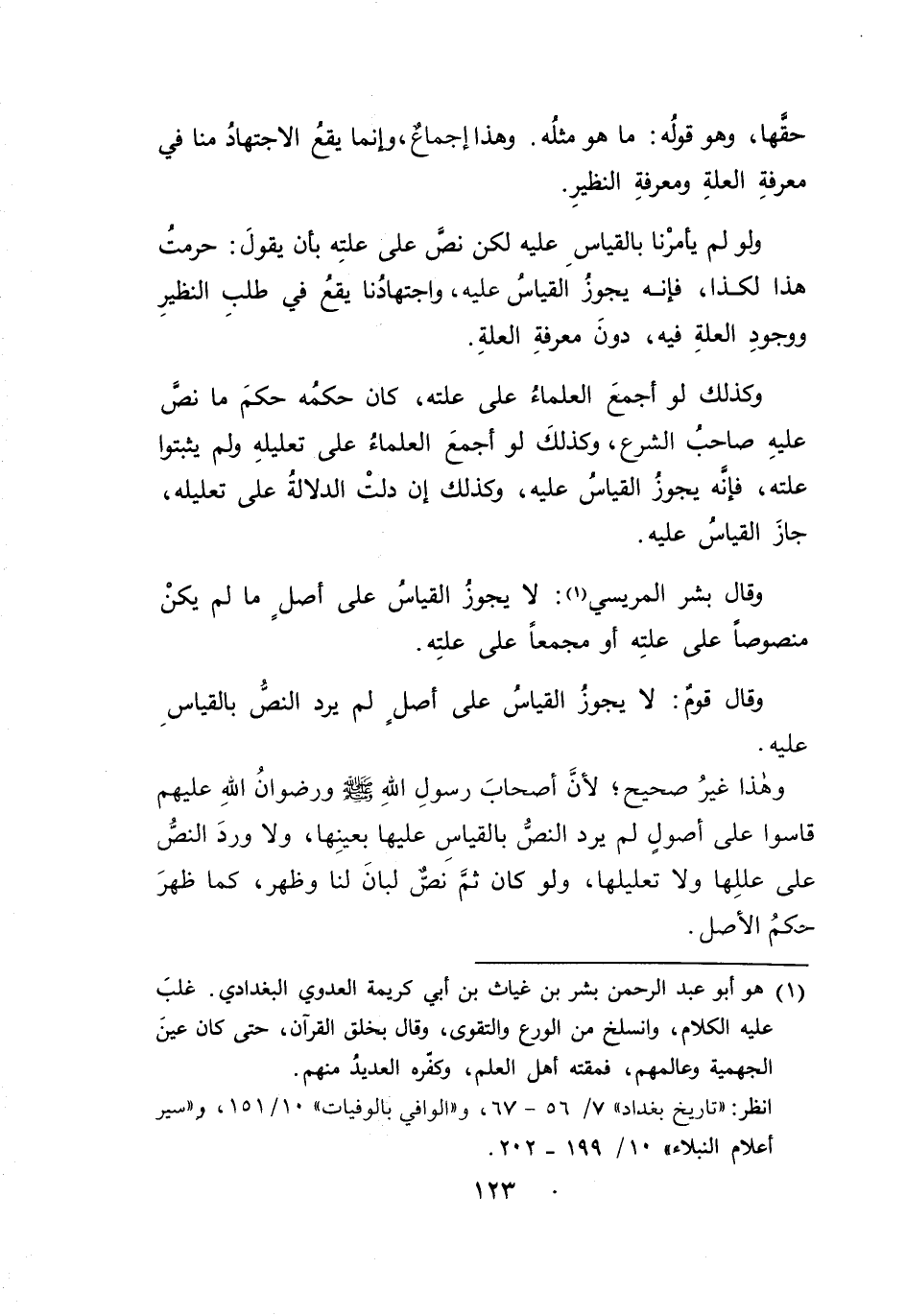 وقال بشر المريسي (١): لا يجوزُ القياسُ على أصلٍ ما لم يكنْ منصوصاً على علتِه أومجمعاً على علتِه.