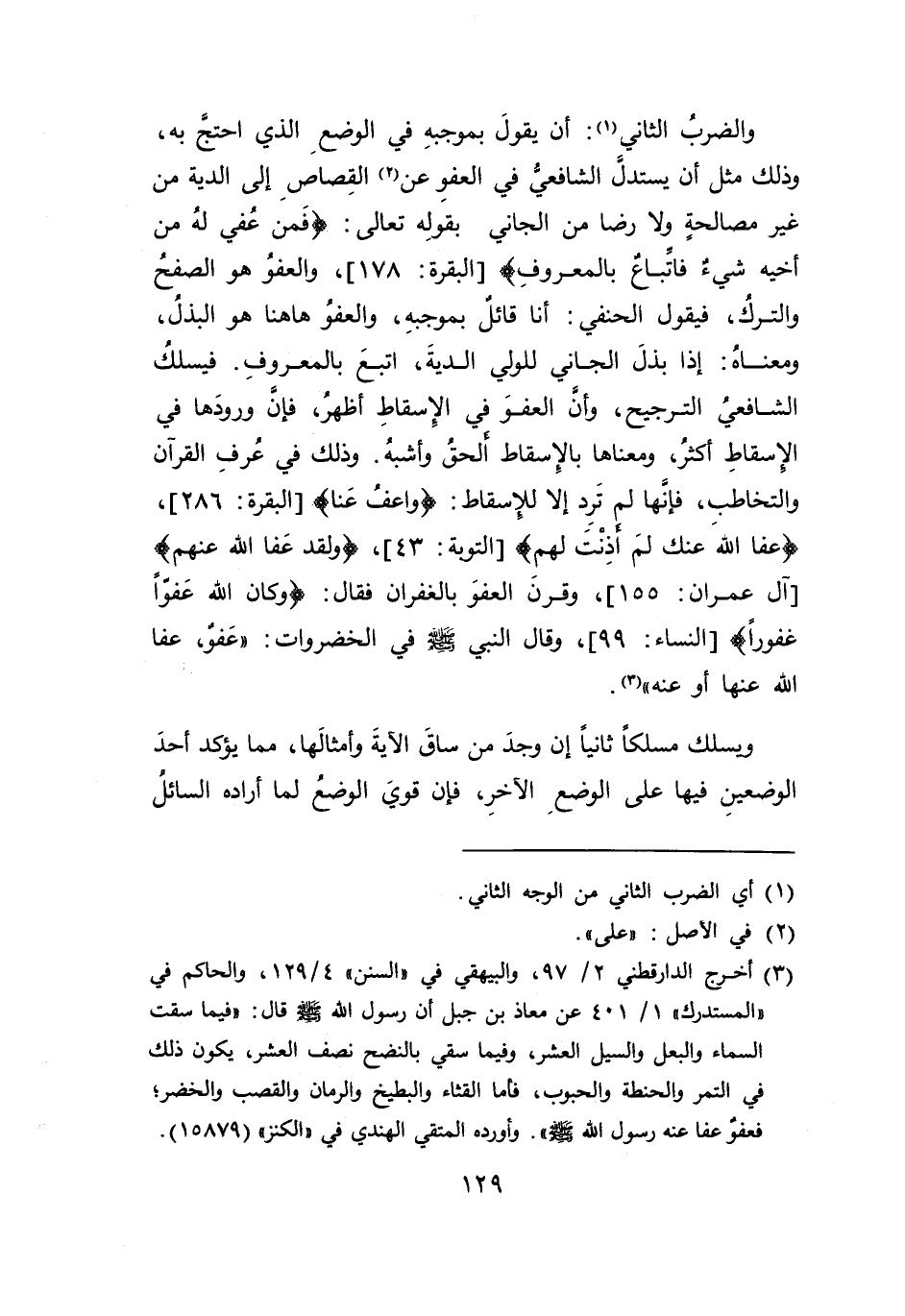 والضربُ الثاني (١): أن يقولَ بموجبهِ في الوضعِ الذي احتجَّ به، وذلك مثل أن يستدل الشافعيُّ في العفوِ عن (٢)، القِصاص إلى الدية من غير مصالحةٍ ولا رضا من الجاني بقولِه تعالى: {فَمَنْ عُفِيَ لَهُ مِنْ أَخِيهِ شَيْءٌ فَاتِّبَاعٌ بِالْمَعْرُوفِ} [البقرة: ١٧٨]، والعفوُ هو الصفحُ والتركُ، فيقول الحنفي: أنا قائل بموجبهِ، والعفو هاهنا هو البذل، ومعناة: إذا بذلَ الجاني للولي الديةَ، اتبعَ بالمعروفِ. فيسلك الشافعى الترجيح، وأن العفوَ في الإِسقاطِ أظهر، فإنَ ورودَها في الإسقاطِ أكثر، ومعناها بالإِسقاط ألحق وأشبهُ. وذلك في عرفِ القرآن والتخاطب، فإنَها لم تَرِد إلا للإِسقاط: {واعف عَنا} [البقرة: ٢٨٦]، {عَفَا اللَّهُ عَنْكَ لِمَ أَذِنْتَ لَهُمْ} [التوبة: ٤٣]، {وَلَقَدْ عَفَا اللَّهُ عَنْهُمْ} [آل عمران: ١٥٥]، وقرنَ العفوَ بالغفران فقال: {وَكَانَ اللَّهُ عَفُوًّا غَفُورًا} [النساء: ٩٩]، وقال النبي صلى الله عليه وسلم في الخضروات: "عَفوّ، عفا الله عنها أو عنه" (٣).