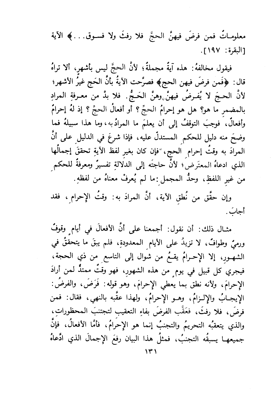 وإن حقَق من نطقِ الآية، أنَّ المرادَ به: وقتُ الِإحرامِ، فقد أجابَ. مثال ذلك: أن نقول: أجمعنا على أن الأفعالَ في أيامٍ وقوفٌ ورمي وطواف، لا تزيدُ على الأيام المعدودةِ، فلم يبقَ ما يتحققُ في الشهورِ، إلا الإِحرامُ يقعُ من شَوال إلى التاسع من ذي الحجة، فيجري كلُّ قبيل في يومٍ من هذه الشهورِ، فهو وقتٌ ممتدٌ لمن أرادَ الإِحرامَ، ولأنه نطق بما يعطي الِإحرامَ، وهو قوله: فَرَضَ، والفرض: الِإيجابُ والِإلزامُ، وهو الِإحرامُ، ولهذا عقَبه بالنهي، فقال: فمن فرضَ، فلا رفثَ، فعَقَب الفرضَ بفاءِ التعقيب لتجتنبَ المحظوراتِ، والذي يتعقبُه التحريم والتجنبُ إنما هو الإِحَرام، فأمَّا الأفعال، فإن جميعها يسبقه التجنب، فمثلُ هذا البيان رفعَ الإِجمالَ الذي ادَّعاهُ