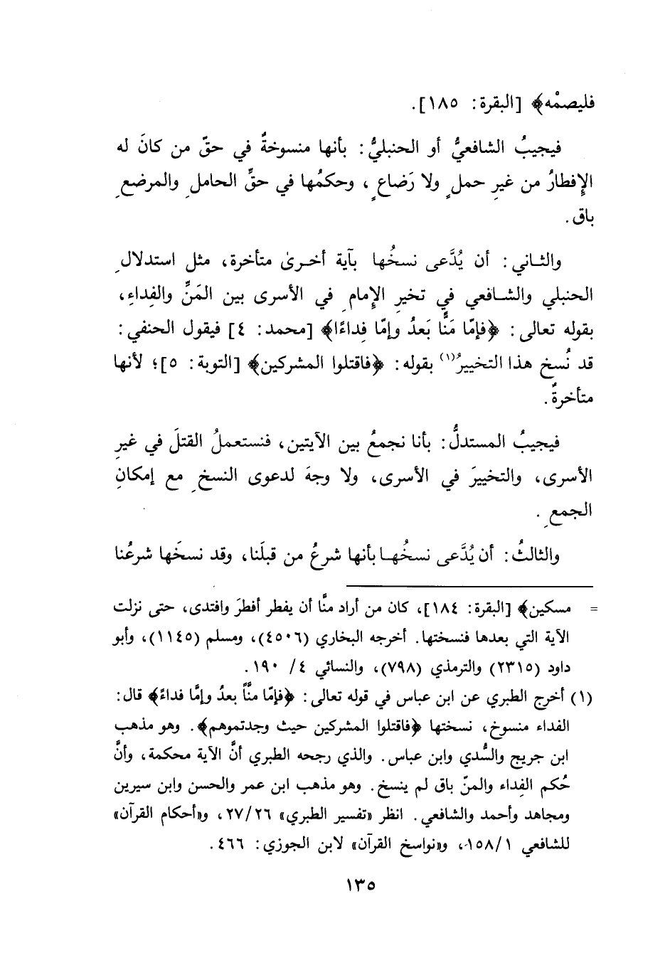 (١) أخرج الطبري عن ابن عباس في قوله تعالى: {فَإِمَّا مَنًّا بَعْدُ وَإِمَّا فِدَاءً} [محمد: ٤] قال: الفداء منسوخ، نسختها {فَاقْتُلُوا الْمُشْرِكِينَ حَيْثُ وَجَدْتُمُوهُمْ}. وهو مذهب ابن جريج والسدي وابن عباس. والذي رجحه الطبري أن الآية محكمة، وأن حُكم الفِداء والمن باق لم ينسخ. وهو مذهب ابن عمر والحسن وابن سيرين ومجاهد وأحمد والشافعي. انظر "تفسير الطبري" ٢٧/ ٢٦، و"أحكام القرآن" للشافعي ١/ ١٥٨، و"نواسخ القرآن" لابن الجوزي: ٤٦٦.