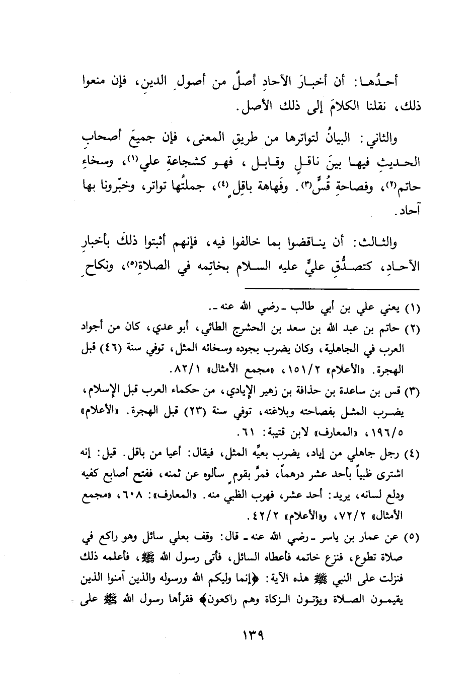 والثاني: البيان لتواترها من طريقِ المعنى، فإن جميعَ أصحابِ الحديثِ فيها بينَ ناقلٍ وقابل، فهو كشجاعةِ علي (١)، وسخاءِ حاتم (٢)، وفصاحةِ قُسٍّ (٣). وفَهاهة باقِلٍ (٤)، جملتها تواتر، وخبّرونا بها آحاد.