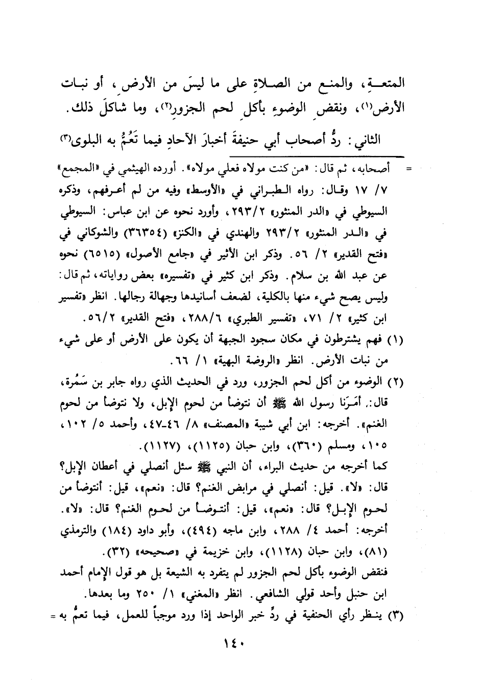 (٢) الوضوء من أكل لحم الجزور، ورد في الحديث الذي رواه جابر بن سَمُرة، قال:" أمَرَنا رسول الله ي أن نتوضأ من لحوم الإبل، ولا نتوضأ من لحوم الغنم". أخرجه: ابن أبي شيبة "المصنف" ٨/ ٤٦ - ٤٧، وأحمد ٥/ ١٠٢، ١٠٥، ومسلم (٣٦٠)، وابن حبان (١١٢٥)، (١١٢٧).