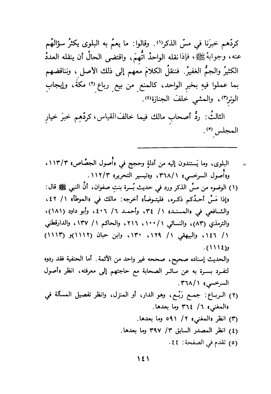 كردّهم خبرَنا في مسّ الذكر (١). وقالوا: ما يعمُ به البلوى يكثرُ سؤالهُم عنه، وجوابه - صلى الله عليه وسلم -، فإذا نقله الواحدُ اتُّهِمَ، واقتضى الحالُ أن ينقله العددُ الكثير والجمُّ الغفيرُ. فننقلُ الكلامَ معهم إلى ذلك الأصلِ، ونناقضهم بما عملوا فيهِ بخبرِ الواحد، كالمنعِ من بيعِ رباع (٢) مكةَ، وإيجابِ الوتر (٣)، والمشي خلفَ الجنازة (٤).