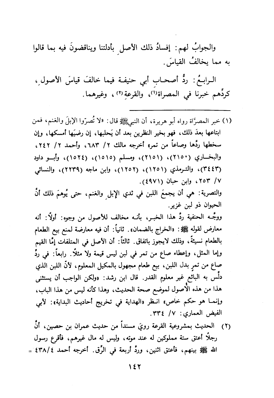 ووجَّه الحنفية رد هذا الخبر، بأنه مخالف للأصول من وجوه: أولًا: أنه معارض لقوله صلى الله عليه وسلم:" الخراج بالضمان". ثانياً: أن فيه معارضة لمنع بيع الطعام بالطعام نسيئةً، وذلك لايجوز باتفاق. ثالثاً: أن الأصل في المتلفات إمَّا القيم واما المثل، وإعطاء صاع من تمر في لبن ليس قيمة ولا مثلًا. رابعاً: في ردِّ صاع من تمرٍ بدل اللبن، بيع طعام مجهول بالمكيل المعلوم، لأن اللبن الذي دلس به البائع غير معلوم القدر. قال ابن رشد: "ولكن الواجب أن يستثنى هذا من هذه الأصول لموضع صحة الحديث، وهذا كأنه ليس من هذا الباب، وانما هو حكم خاص" انظر "الهداية في تخريج أحاديث البداية": لأبي الفيض العماري: ٧/ ٣٣٤.