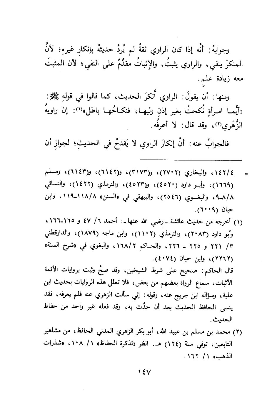 وجوابهُ: أنَه إذا كان الراوي ثقةً لم يُرد حديثهُ بإنكارِ غيرهِ؛ لأن المنكرَ ينفي، والراوي يثبتُ، والإِثباتُ مقدَمٌ على النفي، لأن المثبتَ معه زيادة علمٍ.