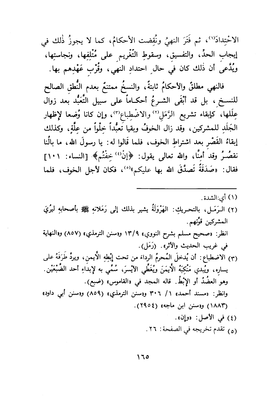 فالنهي مطلق والأحكام ثابتةٌ، والنسخ ممتنع بعدم النطقِ الصالح للنسخِ، بل قد أبْقَى الشرع أحكاماً على سبيل التعَبُّد بعد زوال عِلَلها، كإبقاء تشريع الرمَلِ (٢) والاضْطِباعِ (٣)، وإن كانا وُضعا لاظهار الجَلَدِ للمشركين، وقد زال الخوف وبقيا تعبداً خِلْواً من عِلةٍ، وكذلك إبقاءُ القَصْرِ بعد اشتراطِ الخوف، فلما قَالوا له: يا رسولَ الله، ما بالُنا نقصر وقد أمِنَا، والله تعالى يقول: {إنْ (٤) خِفْتُم} [النساء: ١٠١] فقال: "صَدَقَةٌ تَصدَّقَ الله بها عليكم" (٥)، فكان لأجل الخوف، فلما