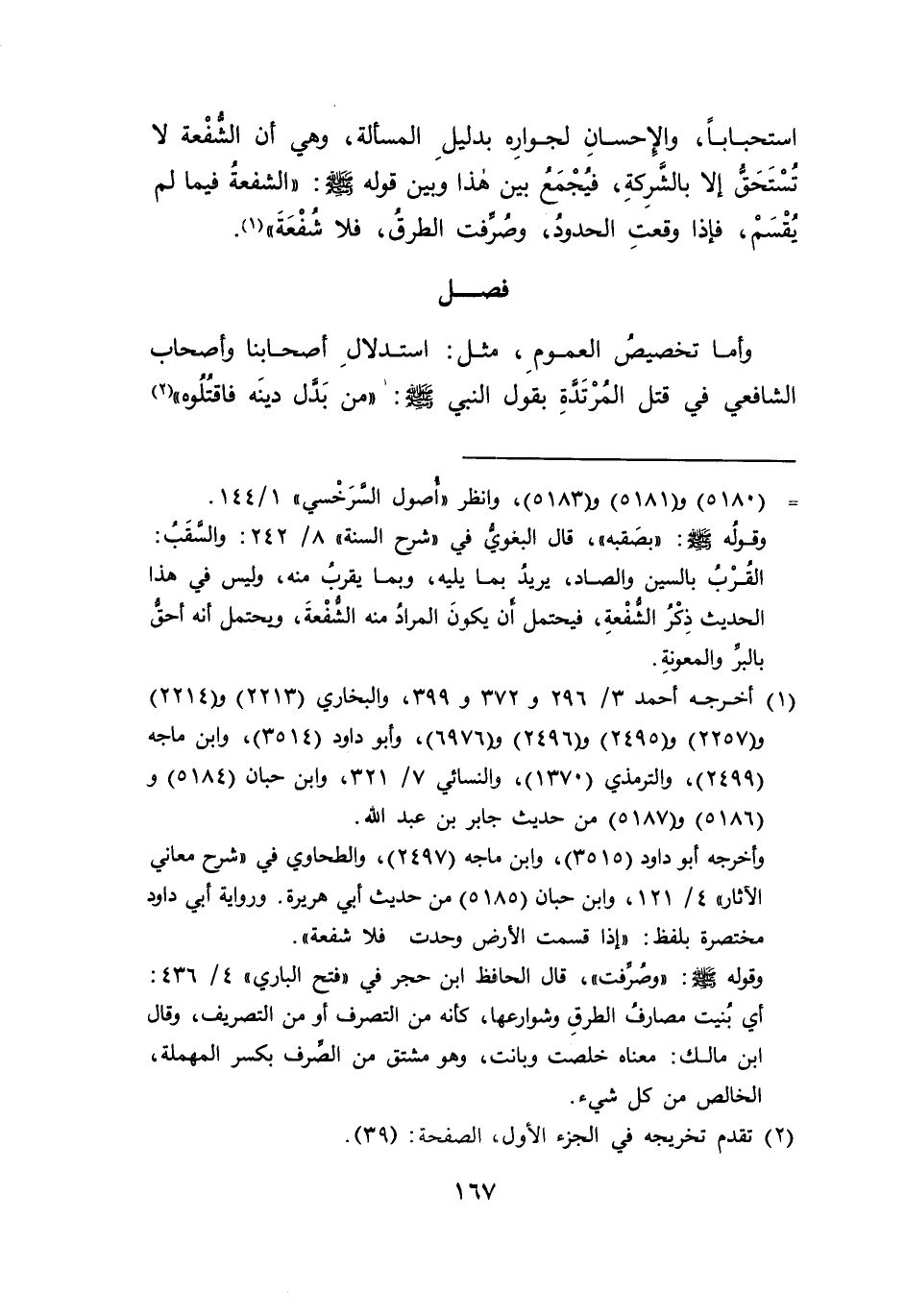 استحباباً، والِإحسانِ لجوارِه بدليلِ المسألة، وهي أن الشُّفْعة لا تُسْتَحَق إلا بالشَرِكةِ، فيُجْمَعُ بين هذا وبين قوله - صلى الله عليه وسلم -: "الشفعةُ فيما لم يُقْسَمْ، فإذا وقعتِ الحدودُ، وصُرِّفت الطرقُ، فلا شُفْعَةَ" (١).