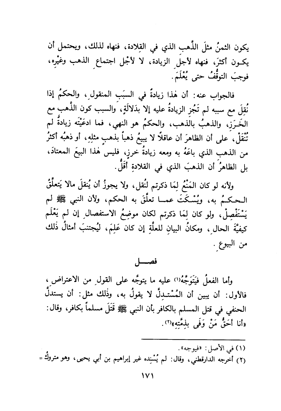 ولأنه لو كان المَنْعُ لِمَا ذكرتم لنُقل، ولا يجوزُ أن يُنقلَ مالا يَتعلَّقُ الحكمُ به، ويُسْكَتَ عما تعلقَ به الحكم، ولأن النبي - صلى الله عليه وسلم - لم يَسْتَفْصِلْ، ولو كان لِمَا ذكرتم لكان موضِعُ الاستفصالِ إن لم يَعْلَم كيفيَّةَ الحالِ، ومكانُ البيانِ للعلَّةِ إن كان عَلِمَ، ليُجتنبَ أمثالُ ذلك من البيوعِ.