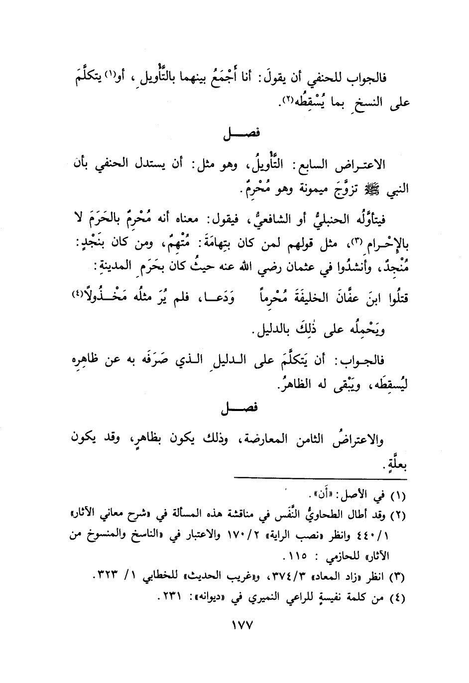 فيتأولُه الحنبلي أو الشافعيُّ، فيقول: معناه أنه مُحْرِم بالحَرَمَ لا بالإِحْرام (٣)، مثل قولهم لمن كان بتِهامَةَ: مُتْهِمٌ، ومن كان بنَجْد: مُنْجِدٌ، وأَنشدُوا في عثمان رضي الله عنه حيثُ كان بحَرَمِ المدينةِ: