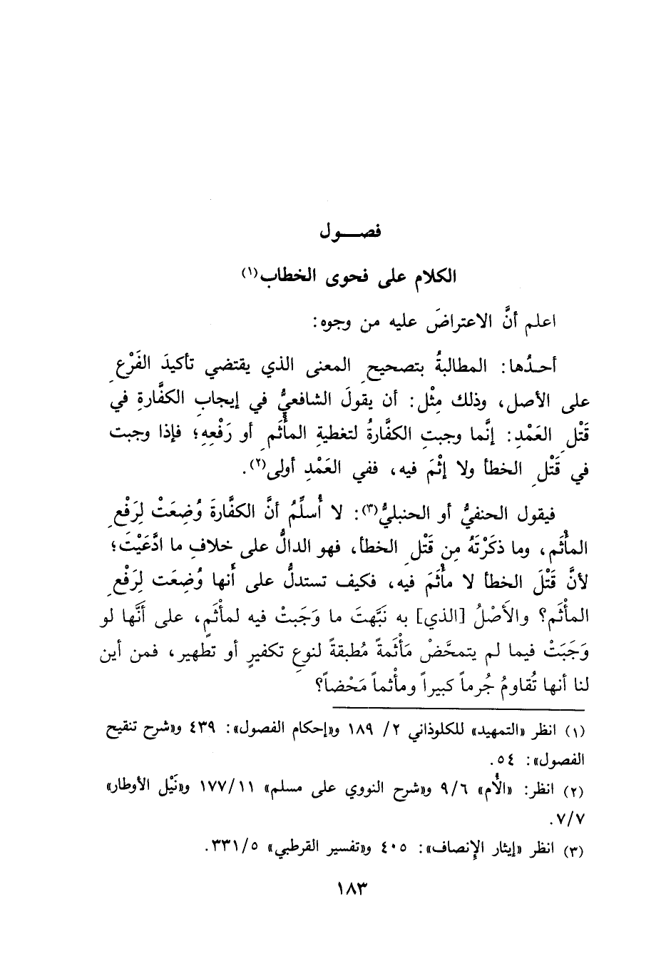 فيقول الحنفيُّ أو الحنبليُّ (٣): لا أسلمُ أنَ الكفارةَ وُضِعَتْ لِرَفْعِ المأثَم، وما ذكَرْتَة مِن قَتْلِ الخطأ، فهو الدالُّ على خلافِ ما ادعَيْتَ؛ لأنَ قَتْلَ الخطأ لا مأثَمَ فيه، فكيف تستدل على أنها وضِعَت لِرَفْعِ المأْثَم؛ والأَصْلُ [الذي] به نَبَّهتَ ما وَجَبتْ فيه لمأْثَمٍ، على أَنَّها لو وَجَبَتْ فيما لم يتمحَّضْ مَأْثَمةً مُطبقةً لنوعِ تكفيرٍ أو تطهير، فمن أين لنا أنها تُقاومُ جُرماً كبيراً ومأْثماً مَحْضاً؛