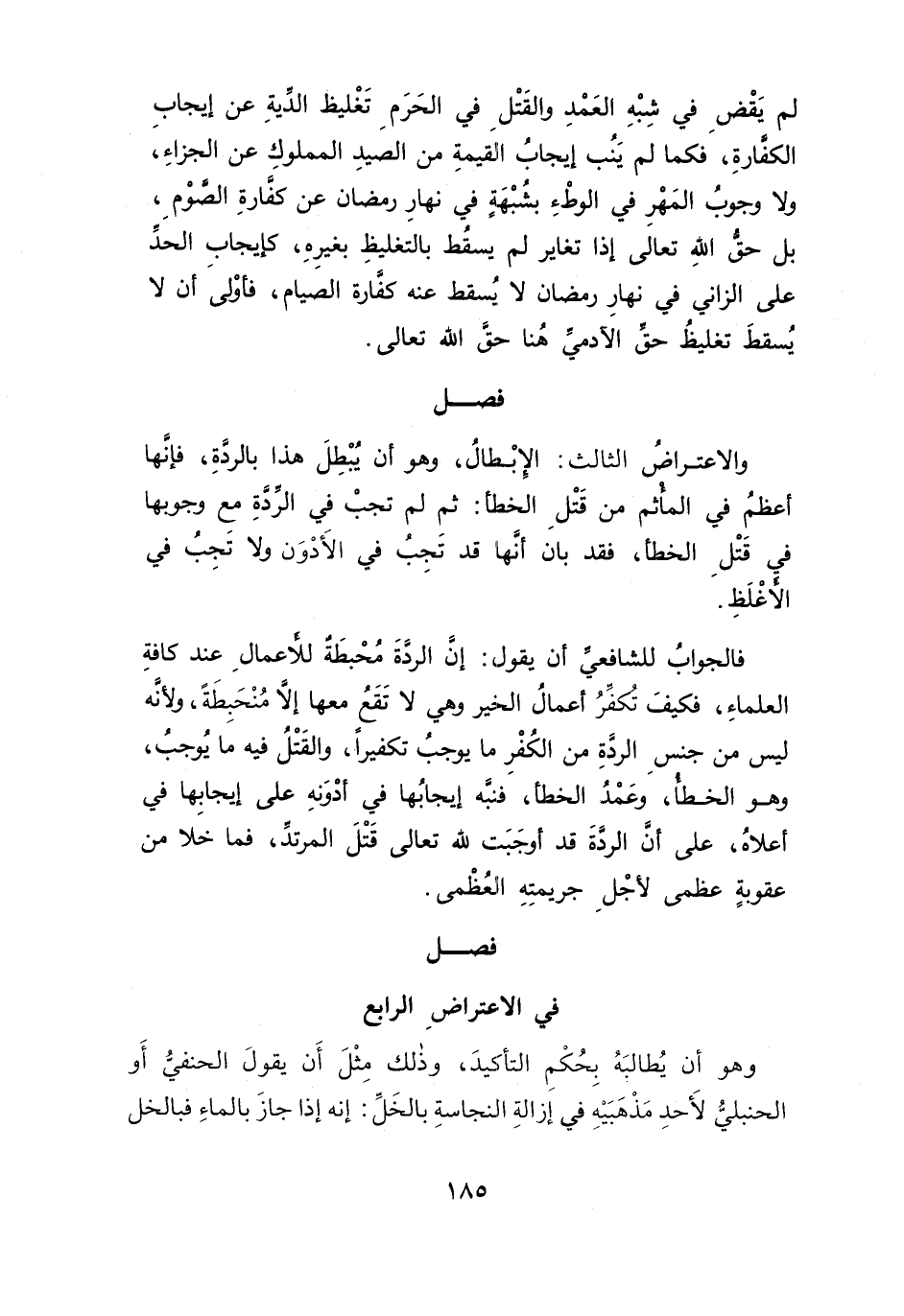 والاعتراضُ الثالث: الإِبْطالُ، وهو أن يُبْطِلَ هذا بالردَةِ، فإنَّها أعظمُ في المأثم من قَتْلِ الخطأ: ثم لم تجبْ في الرِّدَةِ مع وجوبها في قَتْلِ الخطأ، فقد بأن أنَها قد تَجِبُ في الأَدْوَن ولا تَجِبُ في الأغْلَظِ.