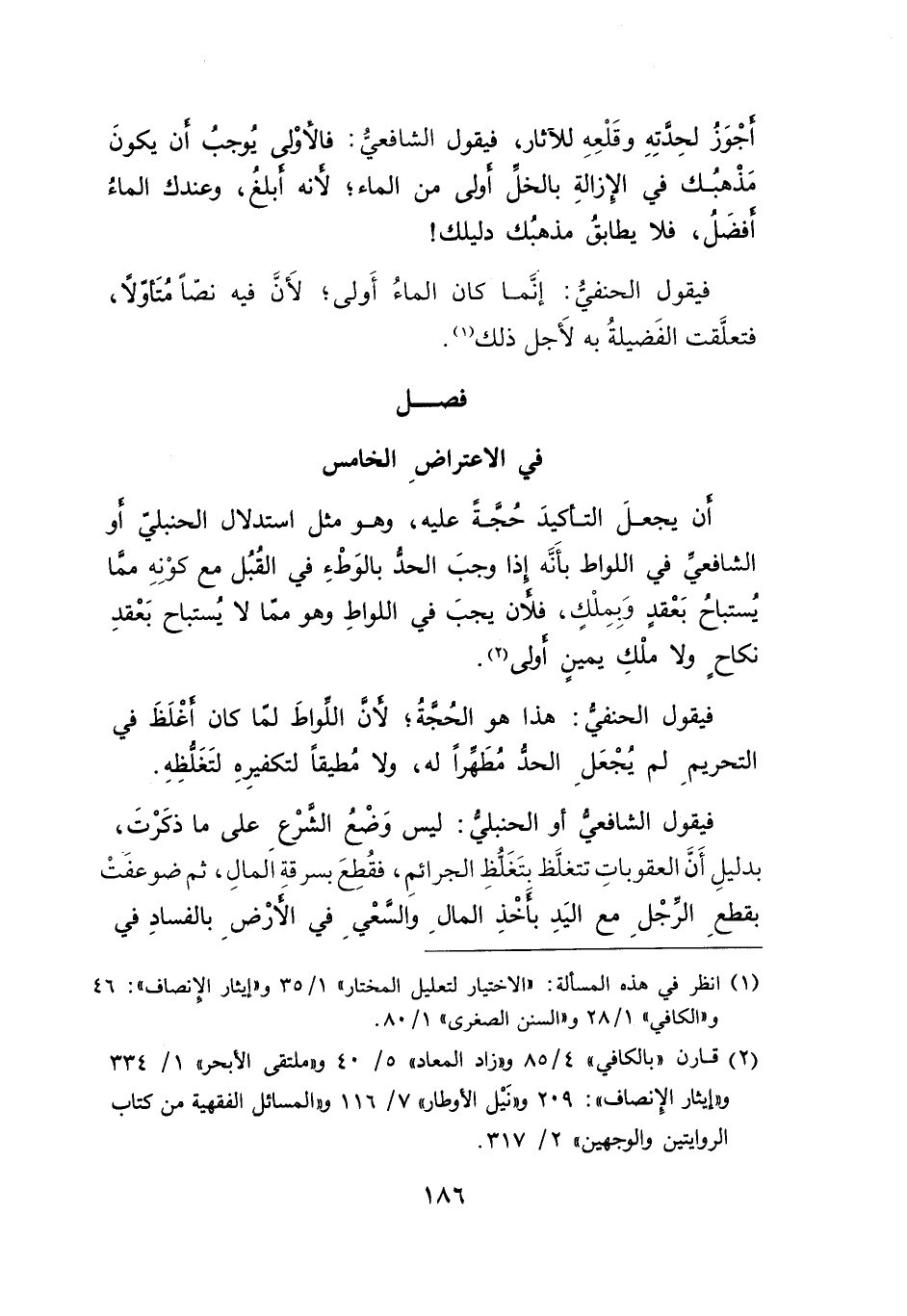 أجْوَزُ لحِدتِهِ وقَلْعِهِ للآثار، فيقول الشافعيُّ: فالأوْلى يُوجبُ أن يكونَ مَذْهبُك في الإِزالةِ بالخلِّ أولى من الماء؛ لأنه أبلغُ، وعندك الماءُ أفضَلُ، فلا يطابقُ مذهبُك دليلك!