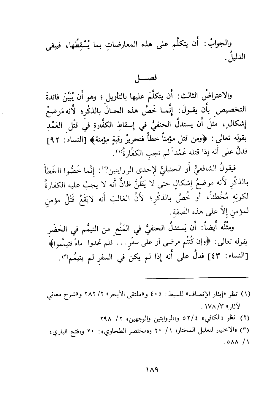 والاعتراضُ الثالث: أن يتكلَّمَ عليها بالتأويلِ؛ وهو أن يُبَينَ فائدةَ التخصيصِ بأن يقولَ: إِنَّما خَصَّ هذه الحالَ بالذكْرِ؛ لأنه مَوضعُ إِشكالٍ، مثلَ أن يستدلَّ الحنفيُّ في إِسقاطِ الكفارةِ في قتْلِ العَمْدِ بقوله تعالى: {وَمَنْ قَتَلَ مُؤْمِنًا خَطَأً فَتَحْرِيرُ رَقَبَةٍ مُؤْمِنَةٍ} [النساء: ٩٢] فدكَ على أَنه إذا قتله عَمْداً لم تجبِ الكفارةُ (١).