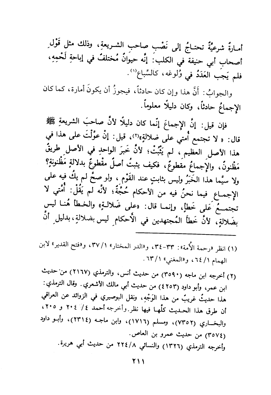 فإن قيل: إن الإجماعَ إنما كان دليلًا لأن صاحبَ الشريعةِ - صلى الله عليه وسلم - قال: "لا تجتمع أمتي على ضلالةٍ" (٢)، قيل: إنْ عولْتَ على هذا في هذا الأصلِ العظيمِ، لم يَثْبُتْ؛ لأن خَبرَ الواحدِ في الأصلِ طريقٌ مَظْنونٌ، والإجماعُ مقطوعٌ، فكيف يثبتُ أصلٌ مقْطوعٌ بدلالةٍ مَظْنونةٍ؟ ولا سيَّما هذا الخَبَرُ وليس بثابتٍ عند القَوْم، ولو صح لم يكُ فيه على الإِجماعِ فيما نحنُ فيه من الأحكام حُجة؛ لأنه لم يَقُلْ: أمتي لا تجتمعُ عَلى خَطأ، وإنما قال: "على ضَلالةٍ" والخطأ هُنا ليس بضَلالةٍ، لأن خَطاَ المُجتهدين في الأحكامِ ليس بضلالةٍ، بدليلِ أن