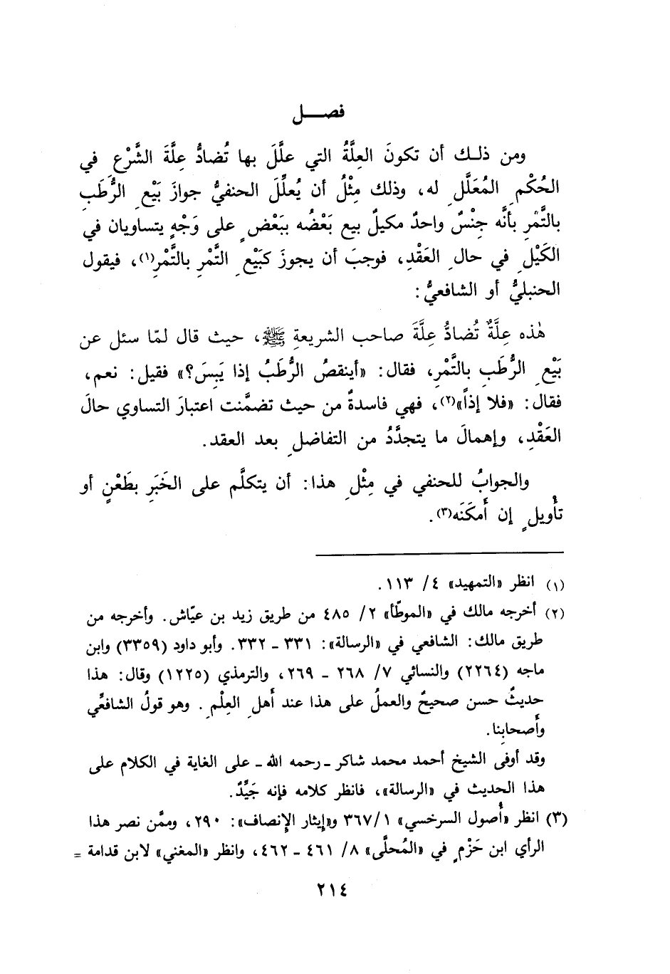 هذه عِلةٌ تُضادُّ عِلَّةَ صاحب الشريعةِ - صلى الله عليه وسلم -، حيث قال لمّا سئل عن بَيْعِ الرطَب بالتمْرِ، فقال: "أينقص الرُّطَب إذا يَبسَ؟ " فقيل: نعم، فقال: "فلاَ إذاً" (٢)، فهي فاسدة من حيث تضمنتَ اعتبارَ التساوي حالَ العَقْدِ، وإهمالَ ما يتجدد من التفاضلِ بعد العقد.