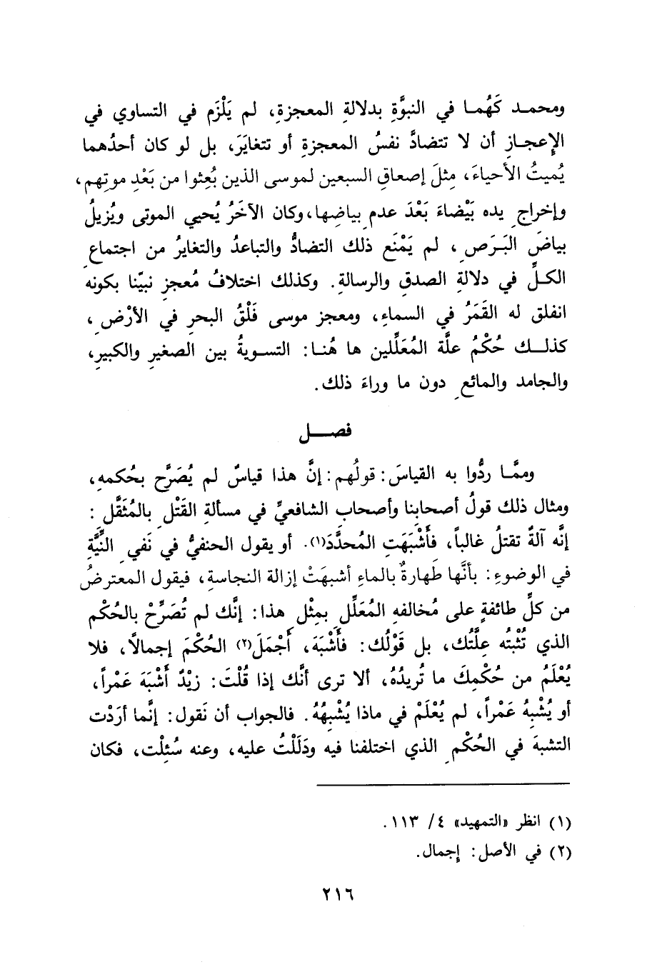 ومحمد كَهُما في النبوَّةِ بدلالةِ المعجزةِ، لم يَلْزَم في التساوي في الإعجاز أن لا تتضادَّ نفسُ المعجزةِ أو تتغايَرَ، بل لو كان أحدُهما يُميتُ الأَحياءَ، مِثلَ إصعاقِ السبعين لموسى الذين بُعِثوا من بَعْدِ موتِهم، وإخراجِ يده بَيْضاءَ بَعْدَ عدم بياضِها، وكان الأخَرُ يُحيي الموتى وُيزيلُ بياضَ البَرَصِ، لم يَمْنَع ذَلك التضاد والتباعدُ والتغايرُ من اجتماعِ الكل في دلالةِ الصدقِ والرسالةِ. وكذلك اختلافُ مُعجزِ نبينا بكونه انفلق له القَمَرُ في السماءِ، ومعجز موسى فَلْقُ البحرِ في الأرْضِ، كذلك حُكْمُ علَّةُ المُعَللين ها هُنا: التسويةُ بين الصغيرِ والكبيرِ، والجامد والمائعِ دون ما وراءَ ذلك.