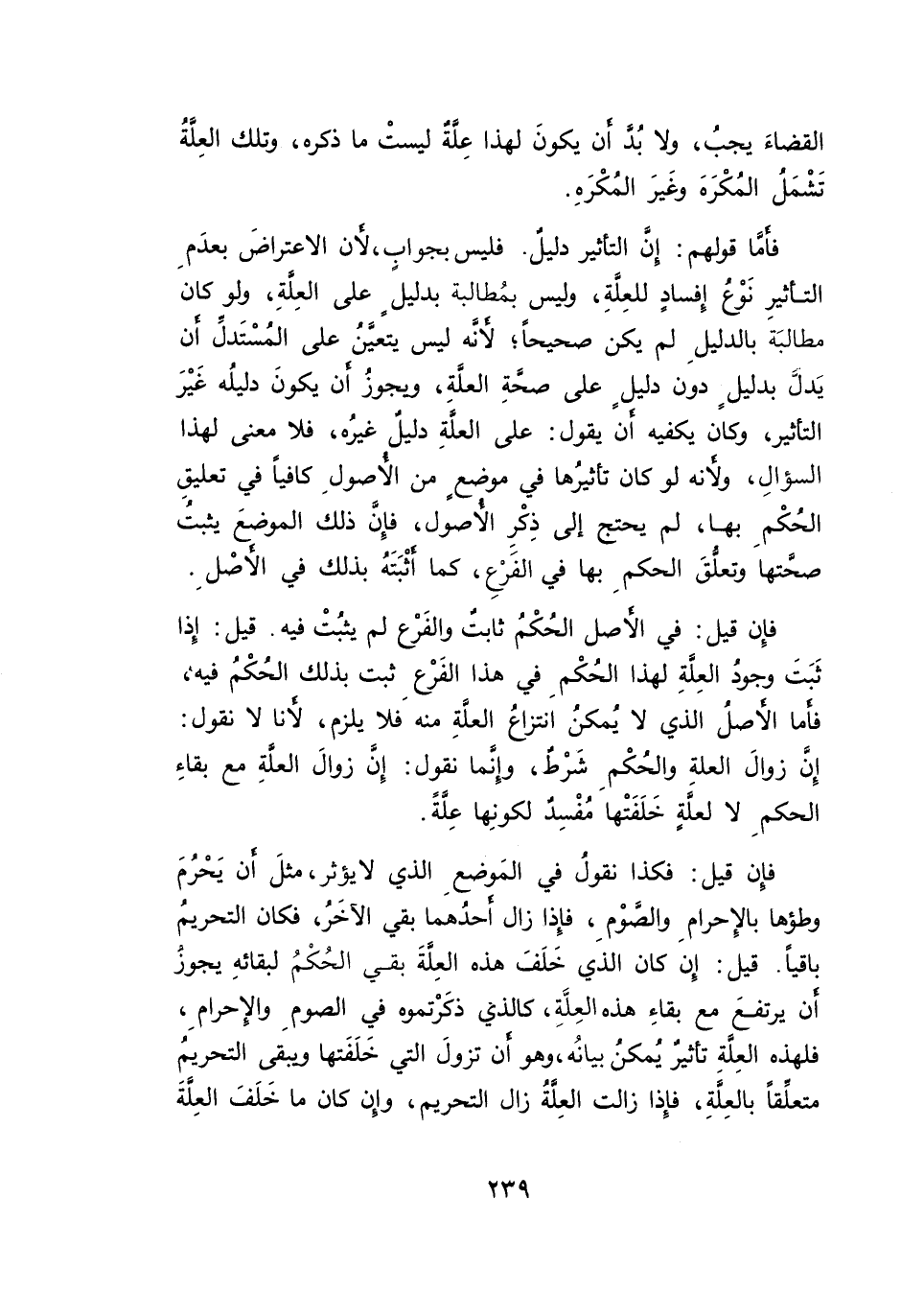 فإن قيل: فكذا نقولُ في المَوضعِ الذي لايؤثر، مثلَ أنَّ يَحْرُمَ وطؤها بالإِحرام والصوْم، فإِذا زال أحدُهما بقي الآخَرُ، فكان التحريمُ باقياً. قيل: إِنَ كان الذَي خَلَفَ هذه العِلةَ بقي الحُكْمُ لبقائهِ يجوز أن يرتفعَ مع بقاءِ هذه العِلَّةِ، كالذي ذكَرْتموه في الصوم والإحرامِ، فلهذه العِلَةِ تأثير يُمكنُ بيانُه، وهو أن تزولَ التي خَلَفَتها ويبَقى التحريمُ متعلقاً بالعِلَّةِ، فإِذا زالت العِلَّةُ زال التحريم، وان كان ما خَلَفَ العِلَةَ