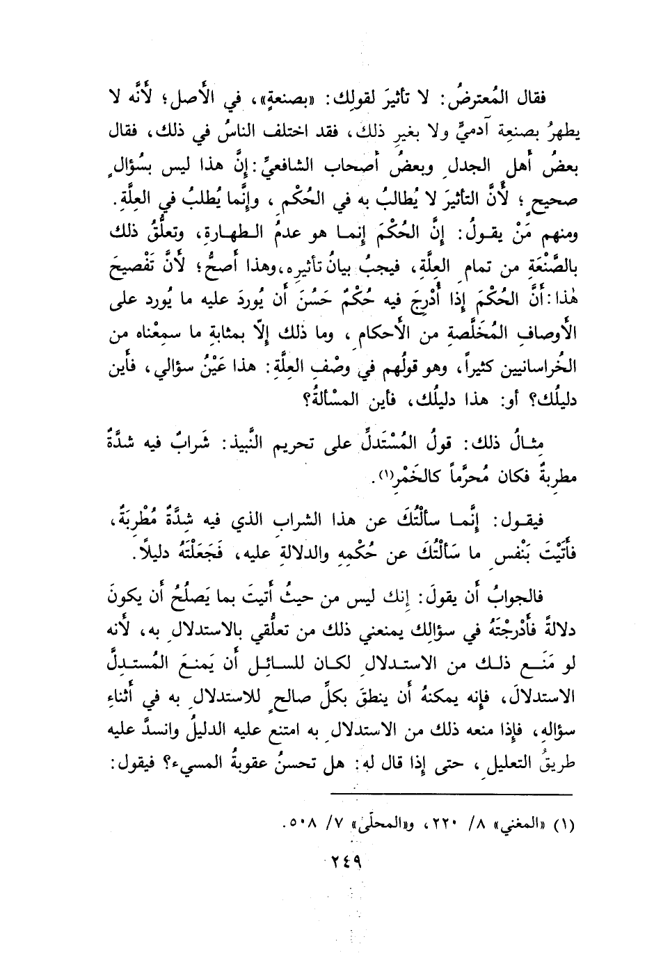 ومنهم مَنْ يقولُ: إن الحُكْمَ إِنما هو عدمُ الطهارةِ، وتعلُّقُ ذلك بالصنْعَةِ من تمام العلَّةِ، فيجبُ بيانُ تأثيرِه، وهذا أصح؛ لأنَ تَفْصيحَ هذا: أنَ الحُكْمَ إذَا أَدْرِجَ فيه حُكْم حَسُنَ أن يُوردَ عليه ما يُورد على الأوصافِ المُخَلصةِ من الأحكامِ، وما ذلك إلّا بمثابةِ ما سمِعْناه من الخُراسانيين كثيراً، وهو قولُهم في وصْفِ العِلَّةِ: هذا عَيْنُ سؤالي، فأين دليلُك؟ أو: هذا دليلُك، فأين المسْالةُ؟