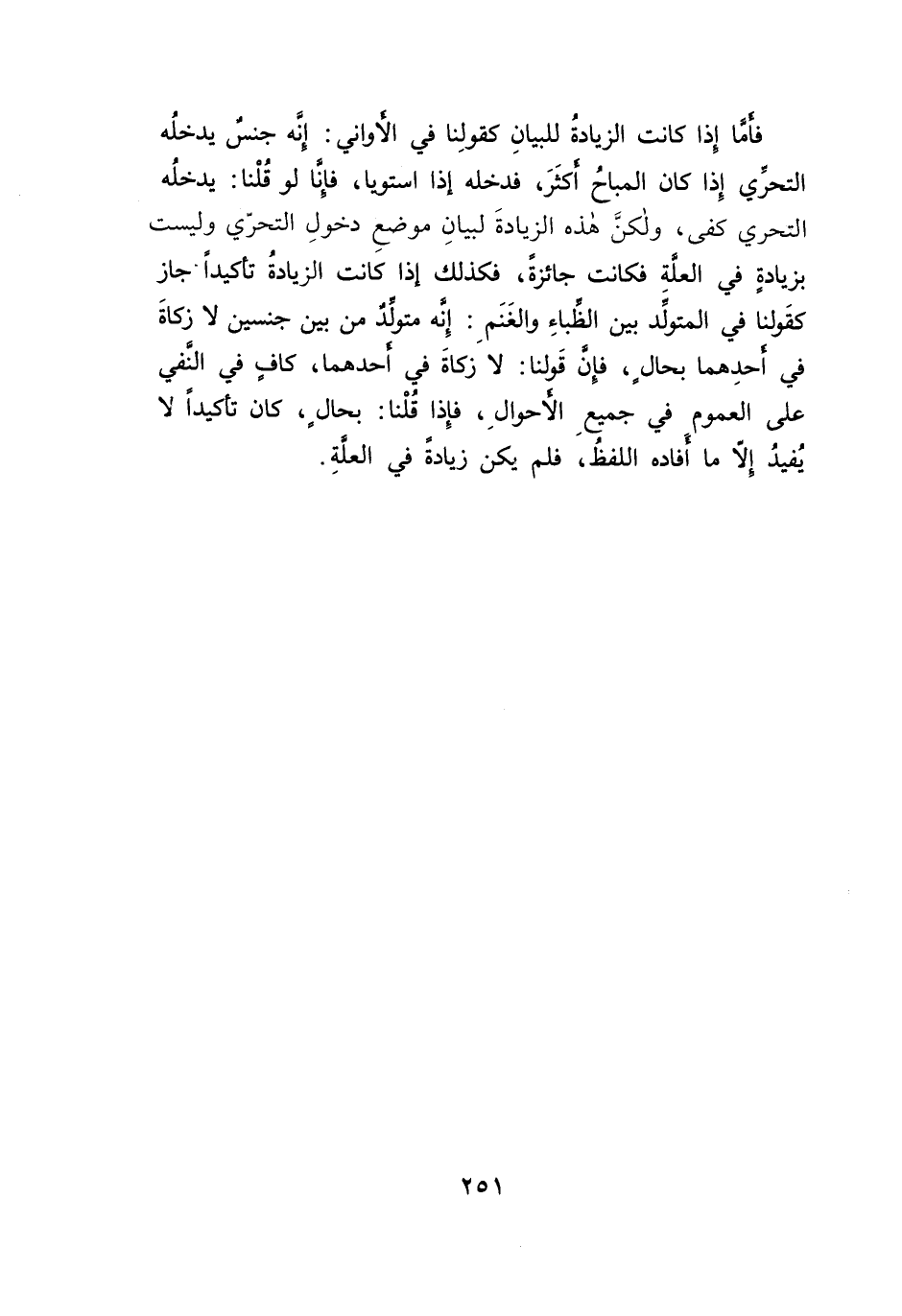 فأمَّا إذا كانت الزيادةُ للبيانِ كقولِنا في الأواني: إنَه جنسٌ يدخلُه التحري إِذا كان المباحُ أكثَرَ، فدخله إذا استويا، فإنا لو قُلْنا: يدخلُه التحري كفى، ولكن هذه الزيادةَ لبيانِ موضعِ دخولِ التحري وليست بزيادةٍ في العلَّة فكانت جائزة، فكذلك إذا كانت الزيادةُ تأكيداً جاز كقَولنا في المتولد بين الظباءِ والغَنَمِ: إِنه متولدٌ من بين جنسين لا زكاةَ في أحدِهما بحال، فإن قَولنا: لا زكاةَ في أحدهما، كافٍ في النَّفي على العموم في جميعِ الأحوالِ، فإِذا قُلْنا: بحال، كان تأكيداً لا يُفيدُ إلأ ما أَفاده اللفظُ، فلم يكن زيادةً في العلَّةِ.
