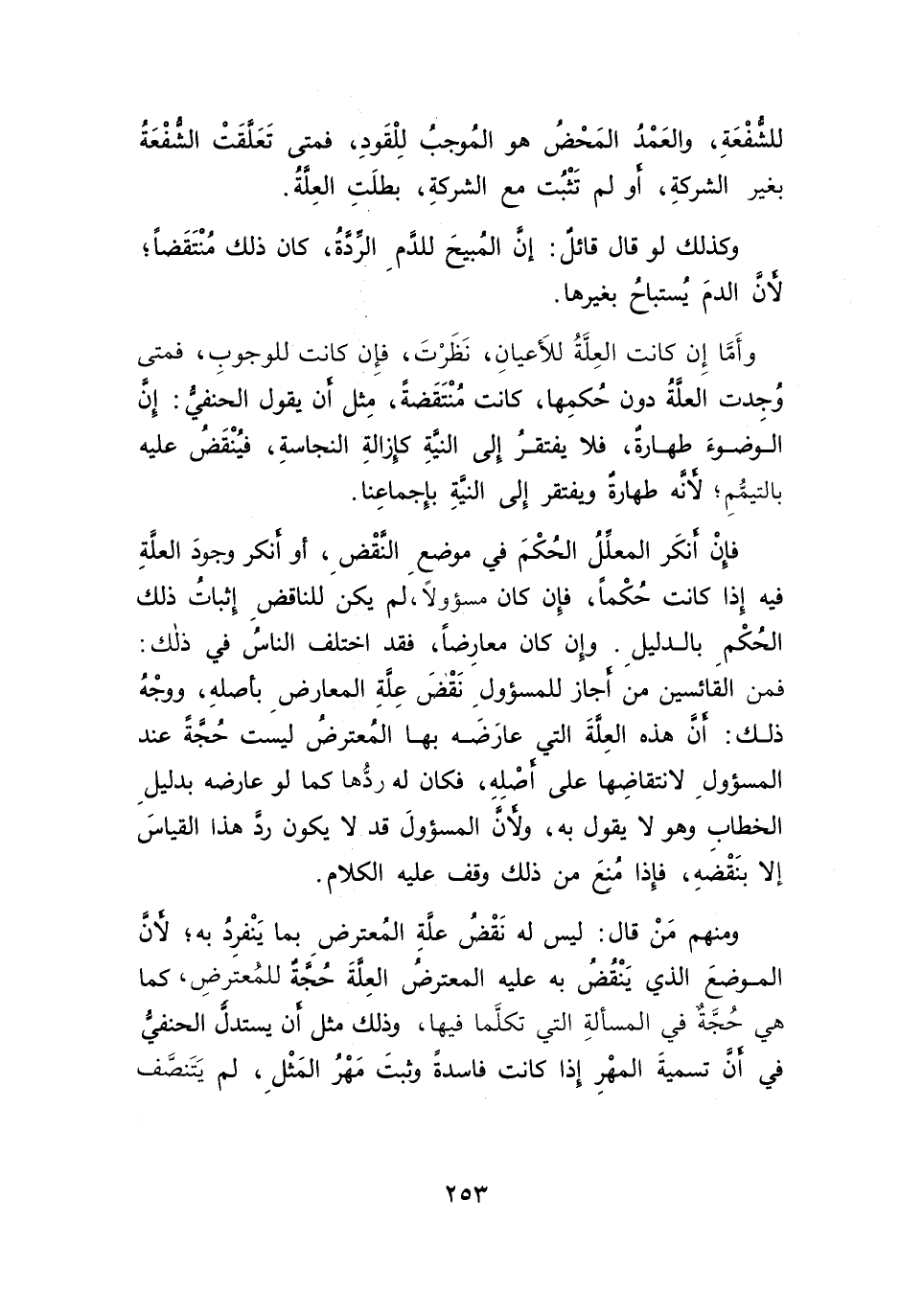 وأَما إِن كانت العِلَّةُ للأَعيانِ، نَظَرْتَ، فإِن كانت للوجوبِ، فمتى وُجِدت العلَّةُ دون حُكمِها، كانت مُنْتَقَضةً، مِثل أن يقول الحنفيُّ: إِنَّ الوضوءَ طهارةٌ، فلا يفتقرُ إِلى النيةِ كإِزالةِ النجاسةِ، فيُنْقَضُ عليه بالتيمُّمِ؛ لأنه طهارةٌ ويفتقر إِلى النيةِ بإِجماعِنا.