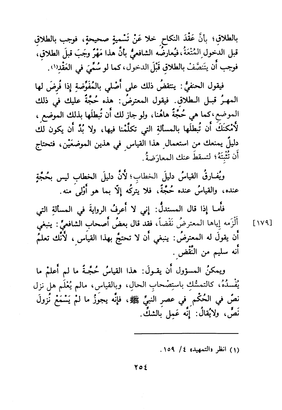 فيقول الحنفيُّ: ينتقضُ ذلك على أصْلي بالمُفَوضةِ إذا فُرِضَ لها المهرُ قبل الطلاقِ. فيقول المعترضُ: هذه حُجةٌ عليك في ذلك الموضع، كما هي حُجةٌ هاهُنا، ولو جاز لك أن تُبطلَها بذلك الموضعِ، لأمْكنَكَ أن تُبطلَها بالمسألةِ التي تكلمْنا فيها، ولا بُدَّ أن يكون لك دليلٌ يمنعك من استعمالِ هذا القياسِ في هذين الموضعَيْن، فتحتاج أَن تُثْبِتَهُ؛ لتسقطَ عنك المعارَضةُ.