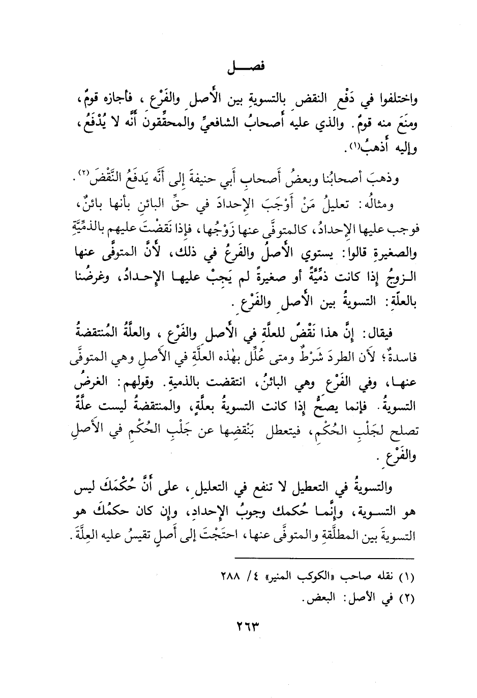 فيقال: إِنَّ هذا نَقْض للعلَّةِ في الأصلِ والفَرْع، والعلَةُ المنتقضةُ فاسدةٌ؛ لأَن الطردَ شَرْط ومتى عُلل بهذه العلَّةِ في الأَصلِ وهي المتوفَى عنها، وفي الفَرْعِ وهي البائنُ، انتقضت بالذميةِ. وقولهم: الغرض التسويةُ. فإنما يصحُّ إِذا كانت التسويةُ بعلَّه، والمنتقضةُ ليست علَّةً تصلح لجَلْبِ الحُكْمِ، فيتعطل بَنْقضِها عن جَلْبِ الحُكْمِ في الَأصلِ والفَرْعَ.