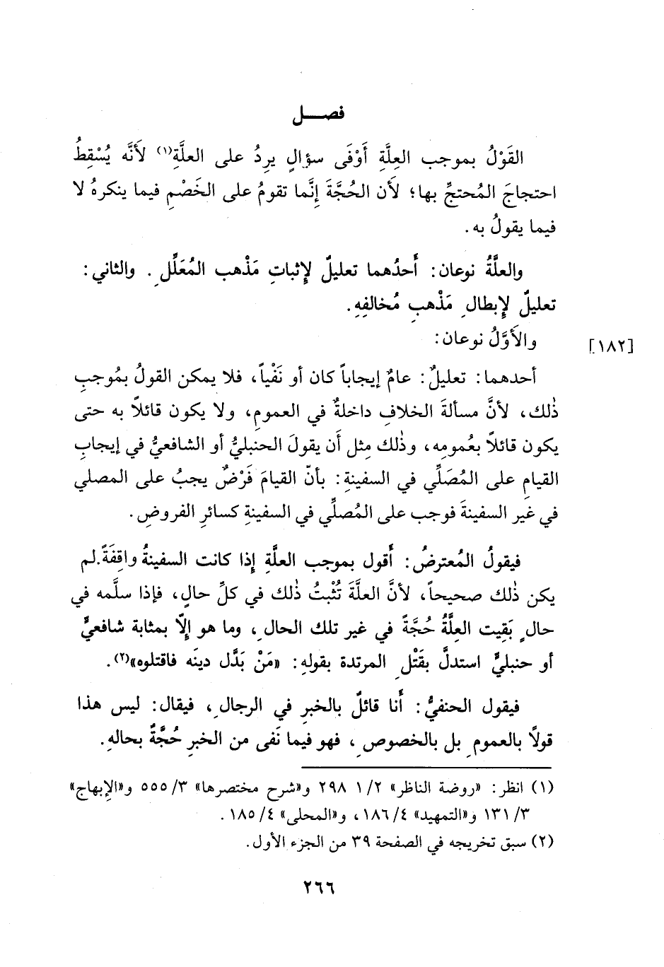 والعلَّةُ نوعان: أحدُهما تعليل لإثباتِ مَذْهب المُعَللِ. والثاني: تعليل لإِبطالِ مَذْهبِ مُخالفِهِ.