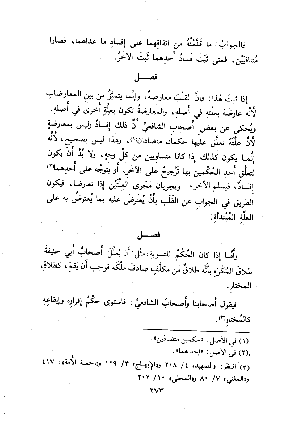 ويُحكى عن بعضِ أصحاب الشافعيُّ أن ذلك إفسادٌ وليس بمعارضةٍ لأن علتَهُ تعلق عليها حكماَن متضادان (١)، وهذا ليس بصحيح، لأنه إنما يكون كذلك اذا كانا متساوِيين من كلُّ وجهٍ، ولا بُدَّ أنَّ يكون لتعلق أحدِ الحُكْمين بها تَرْجيحٌ على الآخَرِ، أو يتوجه على أحدِهما (٢) إِفسادٌ، فيسلم الآخر،. ويجريان مَجْرى العِلتَيْن إذا تعارضا، فيكون الطريق في الجواب عن القَلْب بأنْ يُعتَرضَ عليه بما يُعترضُ به على العلَّةِ المُبْتدأةِ.