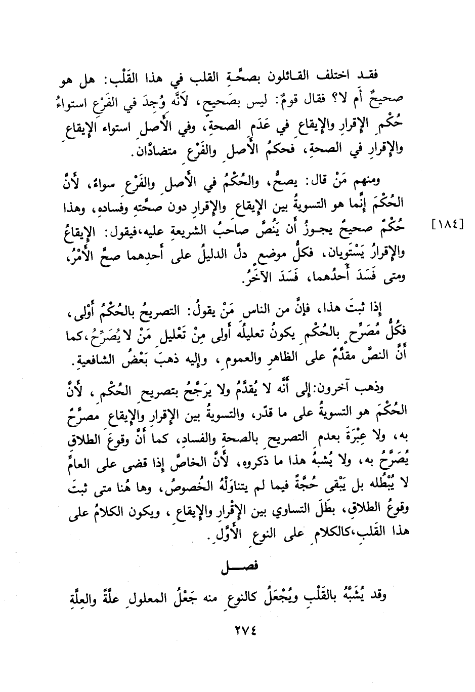 وذهب آخرون: إلى أنه لا يُقدمُ ولا يرَجحُ بتصريحِ الحُكْمِ، لأن الحُكْمَ هو التسويةُ على ما قدر، والتسويةُ بين الإقرارِ والإيقاع مصرحٌ به، ولا عِبْرَةَ بعدمِ التصريحِ بالصحة والفسادِ، كما أن وقوعَ الطلاق يُصَرحُ به، ولا يُشبهُ هذا ما ذكروه، لأَن الخاص إذا قضى على العام لا يُبْطُله بل يَبْقى حُجةً فيما لم يتناوَلْهُ الخُصوصُ، وها هُنا متى ثبتَ وقوعُ الطلاقِ، بطَلَ التساوي بين الإقْرارِ والإيقاعِ، ويكون الكلامُ على هذا القَلبِ، كالكلامِ على النوعِ الأولِ.