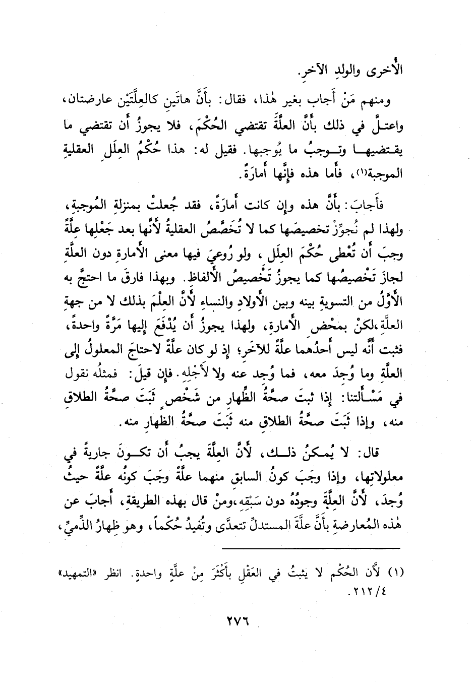 (١) لأن الحُكْم لا يثبتُ في العَقْلِ بأَكْثَرَ مِنْ علَّةٍ واحدةٍ. انظر"التمهيد" ٤/ ٢١٢.
