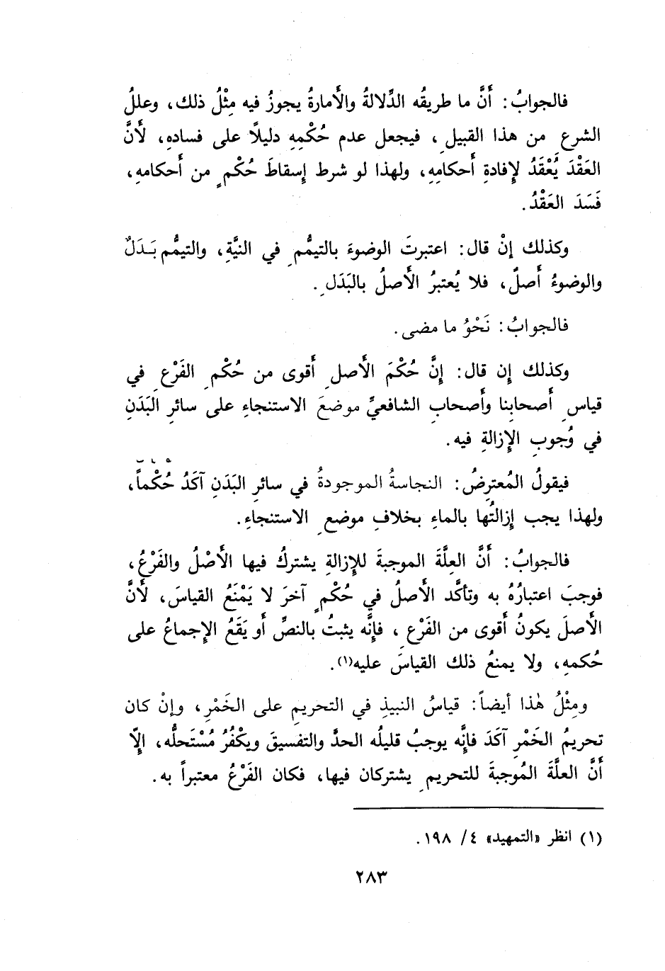 فالجوابُ: أن العِلةَ الموجبةَ للإزالةِ يشتركُ فيها الأصْلُ والفَرْعُ، فوجبَ اعتبارُهُ به وتأكد الأصلُ في حُكْم آخرَ لا يَمْنَعُ القياسَ، لأن الاصلَ يكونُ اقوى من الفَرْعِ، فإنَه يثبتُ بالنص أو يَقَعُ الإجماعُ على حُكمهِ، ولا يمنعُ ذلك القياسَ عليه (١).