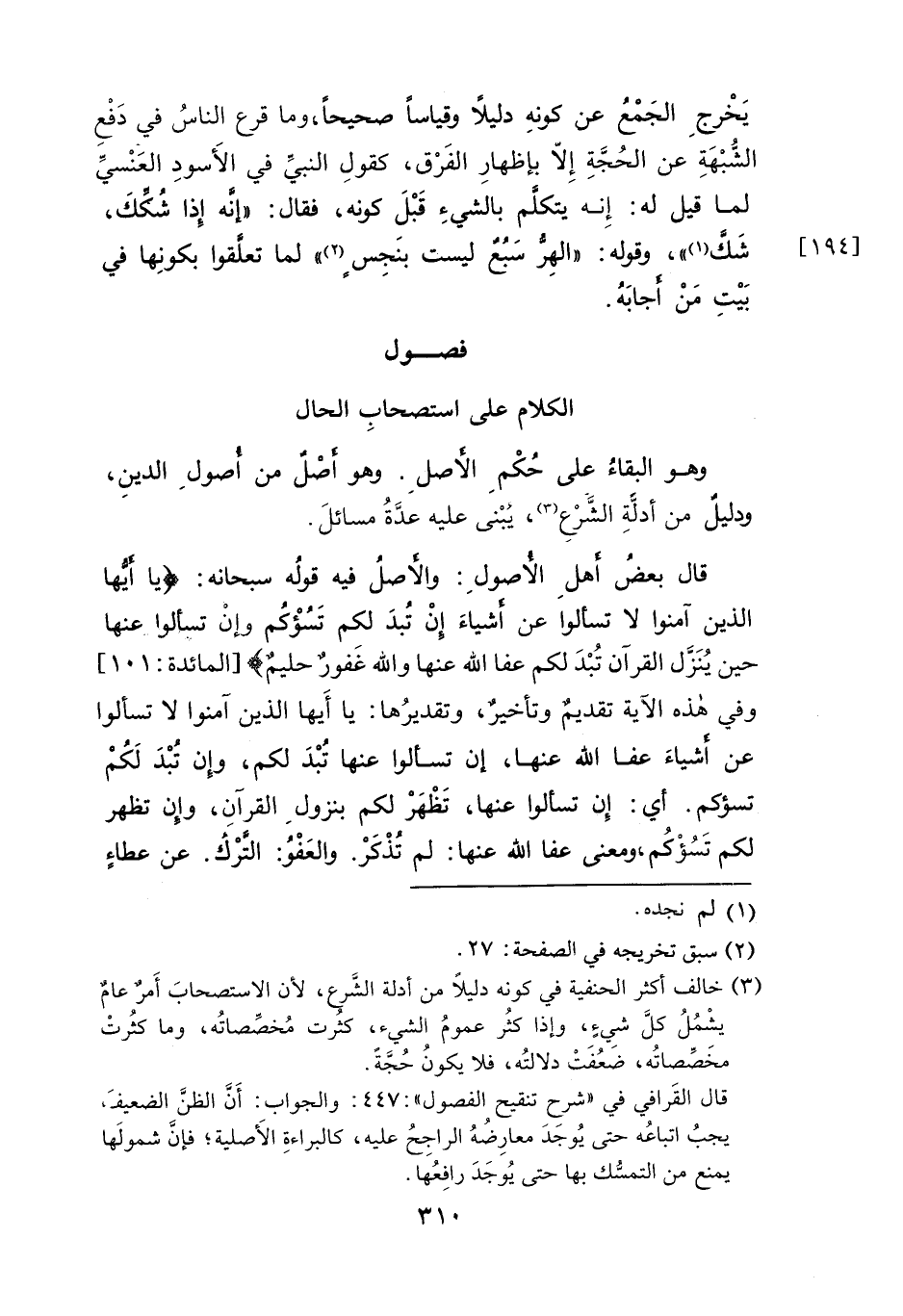 قال بعضُ أهلِ الأصولِ: والأصلُ فيه قولُه سبحانه: {يَا أَيُّهَا الَّذِينَ آمَنُوا لَا تَسْأَلُوا عَنْ أَشْيَاءَ إِنْ تُبْدَ لَكُمْ تَسُؤْكُمْ وَإِنْ تَسْأَلُوا عَنْهَا حِينَ يُنَزَّلُ الْقُرْآنُ تُبْدَ لَكُمْ عَفَا اللَّهُ عَنْهَا وَاللَّهُ غَفُورٌ حَلِيمٌ} [المائدة: ١٠١] وفي هذه الآية تقديم وتأخيرٌ، وتقديرُها: يا أَيها الذين آمنوا لا تسألوا عن أشياءَ عفا الله عنها، إن تسألوا عنها تُبْدَ لكم، وإن تُبْدَ لَكُمْ تسؤكُم. أي: إِن تسألوا عنها، تَظْهَرْ لكم بنزولِ القرآنِ، وان تظهر لكم تَسُؤْكُم، ومعنى عفا الله عنها: لم تُذْكَرْ. والعَفْوُ: الترْكُ. عن عطاءٍ