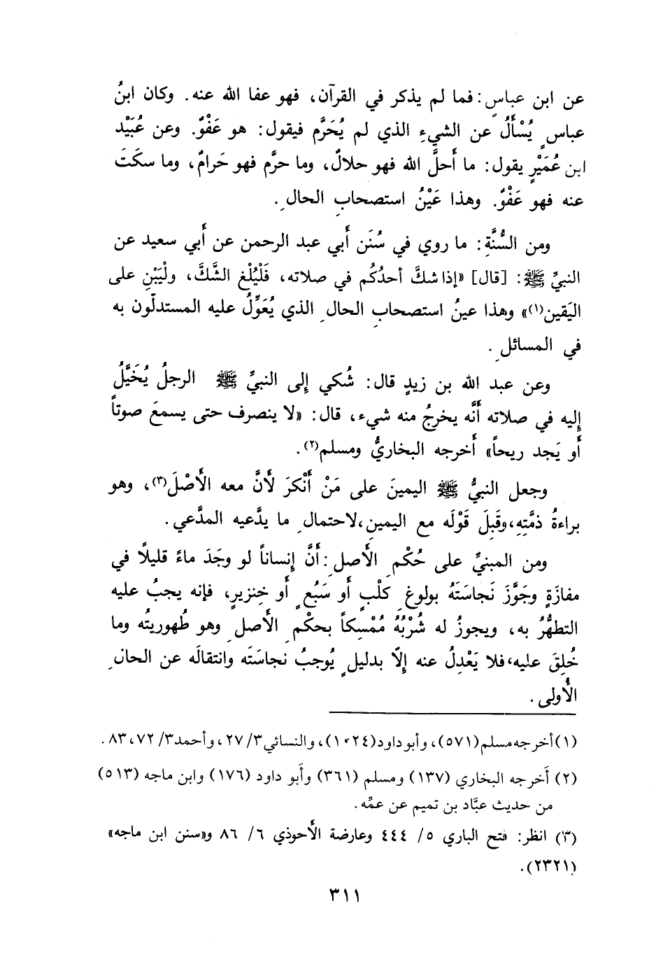 عن ابن عباس: فما لم يذكر في القرآن، فهو عفا الله عنه. وكان ابنُ عباس يُسْأل عن الشيءِ الذي لم يُحَرَّم فيقول: هو عَفْوٌ. وعن عُبَيْد ابن عُمَيْرٍ يقول: ما أحل الله فهو حلالى، وما حرم فهو حَرام، وما سكَتَ عنه فهو عَفوٌ. وهذا عَيْنُ استصحابِ الحالِ.