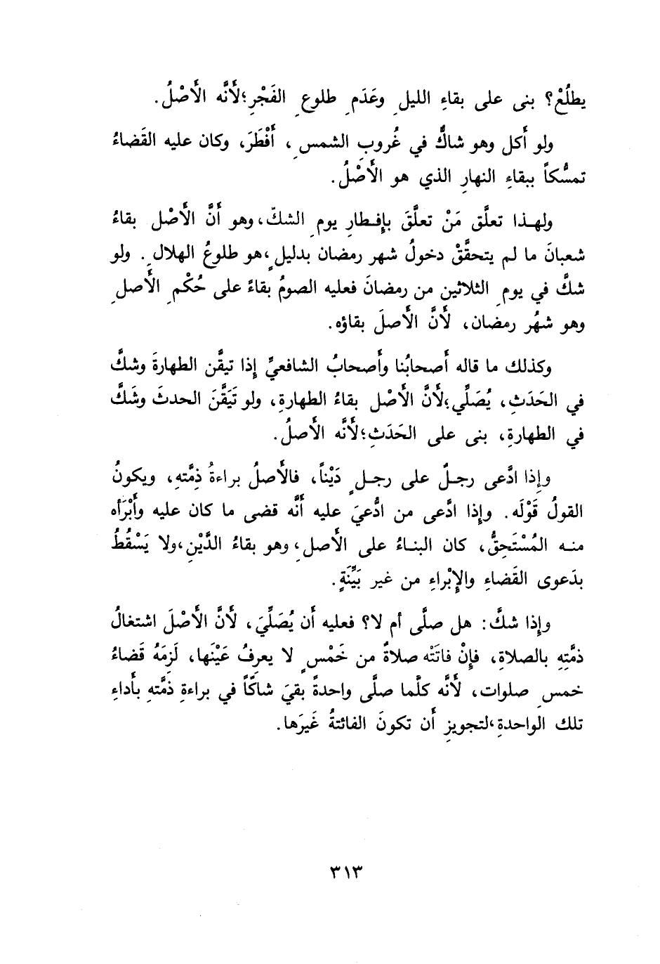 ولهذا تعلَّق مَنْ تعلقَ بإفطارِ يومِ الشكّ، وهو أن الأصْل بقاءُ شعبانَ ما لم يتحققْ دخولُ شهر رمضان بدليل، هو طلوعُ الهلال. ولو شك في يوم الثلاثين من رمضانَ فعليه الصومُ بقاءً على حُكْمِ الأصلِ وهو شهُر رمضان، لأن الأصلَ بقاؤه.