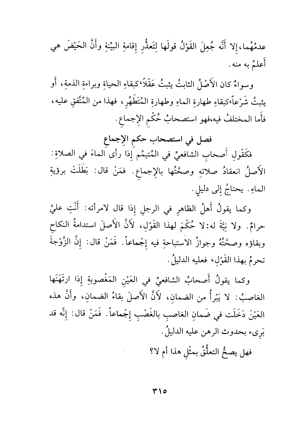 فكَقْولِ اَصحابِ الشافعيِّ في المتيمَّم إِذا رأى الماءَ في الصلاةِ: الأَصلُ انعقادُ صلاتهِ وصحتُها بالإِجماعِ. فمَنْ قال: بَطَلَت برؤيةِ الماءِ. يحتاج إِلى دليلٍ.