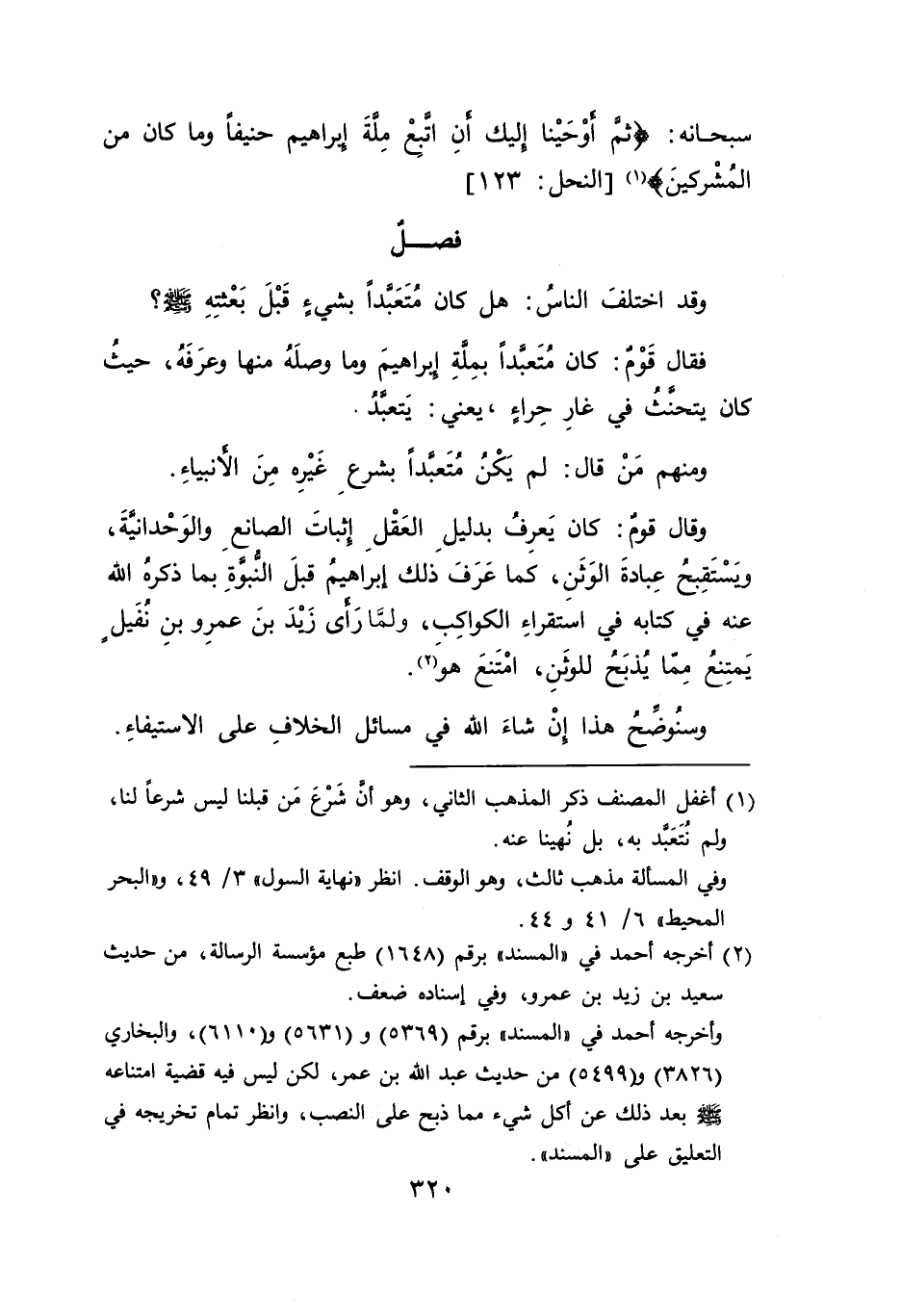 فقال قَوْم: كان مُتَعبداً بمِلةِ إبراهيمَ وما وصلَهُ منها وعرَفَهُ، حيثُ كان يتحنثُ في غارِ حِراءٍ، يعني: يَتعبدُ.