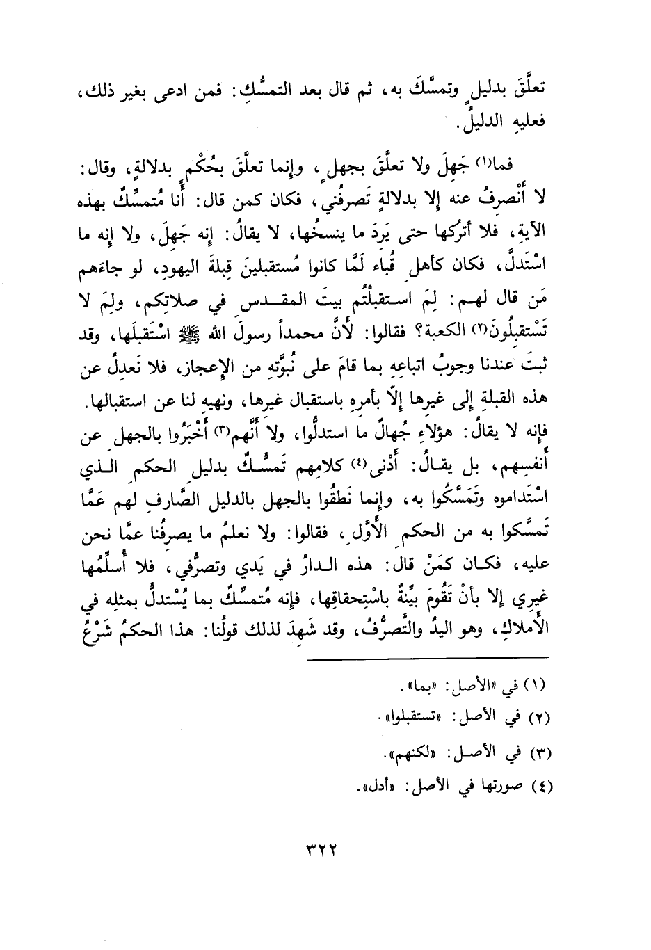 فما (١) جَهِلَ ولا تعلَّقَ بجهلٍ، وانما تعلَّقَ بحُكْمٍ بدلالةٍ، وقال: لا أنْصرِفُ عنه إلا بدلالةٍ تَصرفُني، فكان كمن قال: أنا مُتمسِّكٌ بهذه الآيةِ، فلا أتركها حتى يَرِدَ ما ينسخُها، لا يقالُ: إِنه جَهِلَ، ولا إِنه ما اسْتَدلَّ، فكان كأهلِ قُباء لَمَّا كانوا مُستقبلينَ قِبلةَ اليهودِ، لو جاءَهم مَن قال لهم: لِمَ استقبلْتم بيتَ المقدسِ في صلاتِكم، ولِمَ لا تَسْتقبِلُونَ (٢) الكعبة؟ فقالوا: لأنَّ محمداً رسولَ الله - صلى الله عليه وسلم - اسْتَقبلَها، وقد ثبت عندنا وجوبُ اتباعِهِ بما قامَ على نبوَّتهِ من الإِعجاز، فلا نَعدِلُ عن هذه القبلةِ إلى غيرِها إِلا بأمرِهِ باستقبال غيرِها، ونهيه لنا عن استقبالها.
