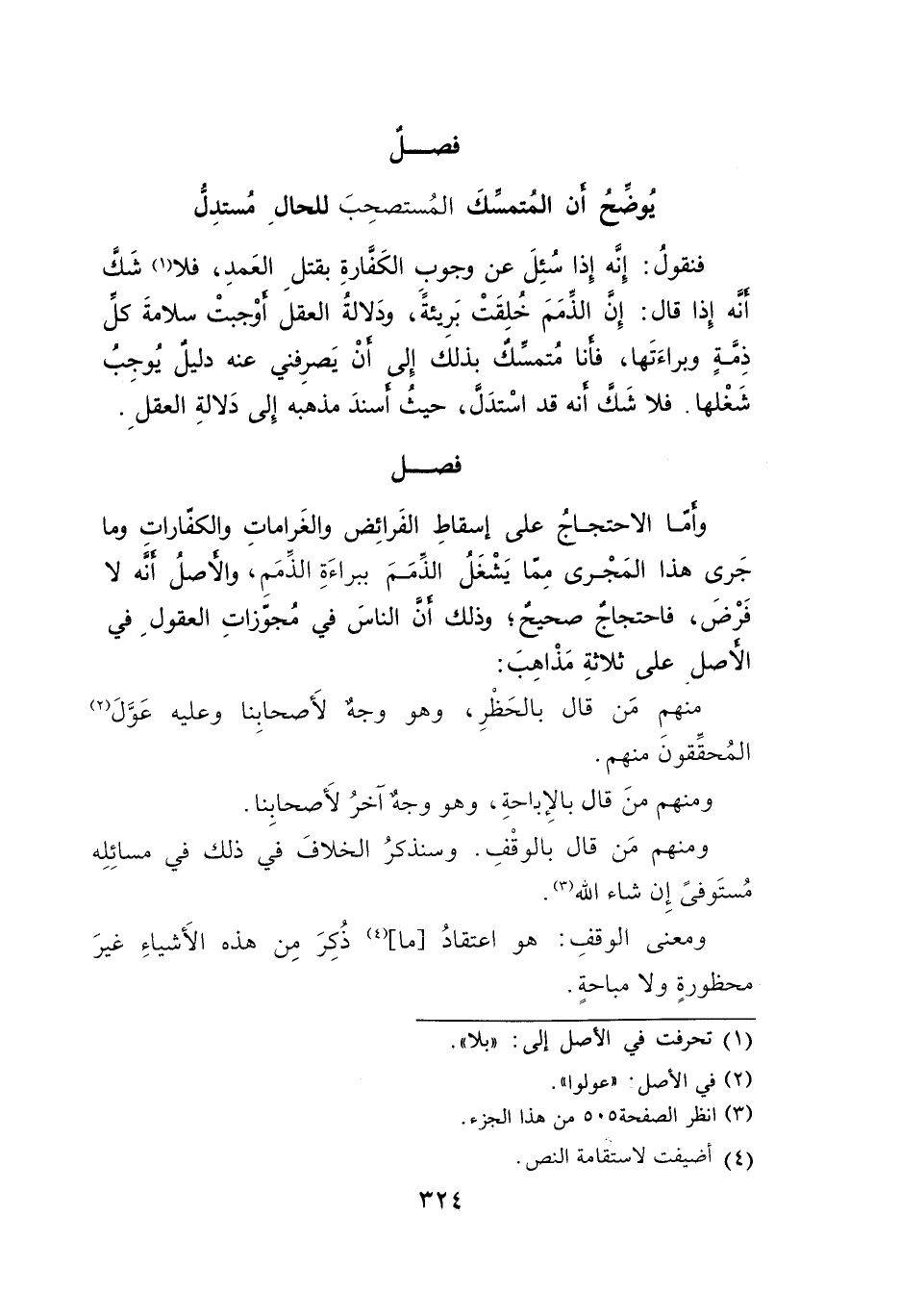 وأمّا الاحتجاجُ على إسقاطِ الفَرائِض والغَراماتِ والكفّارات وما جَرى هذا المَجْرى مِما يَشْغَلُ الذِّمَمَ ببراءَةِ الذِّمَمِ، والأصلُ أنَّه لا فَرْضَ، فاحتجاجٌ صحيح؛ وذلك أنَّ الناسَ في مُجوزاتِ العقولِ في الأصل على ثلاثةِ مَذْاهِبَ: