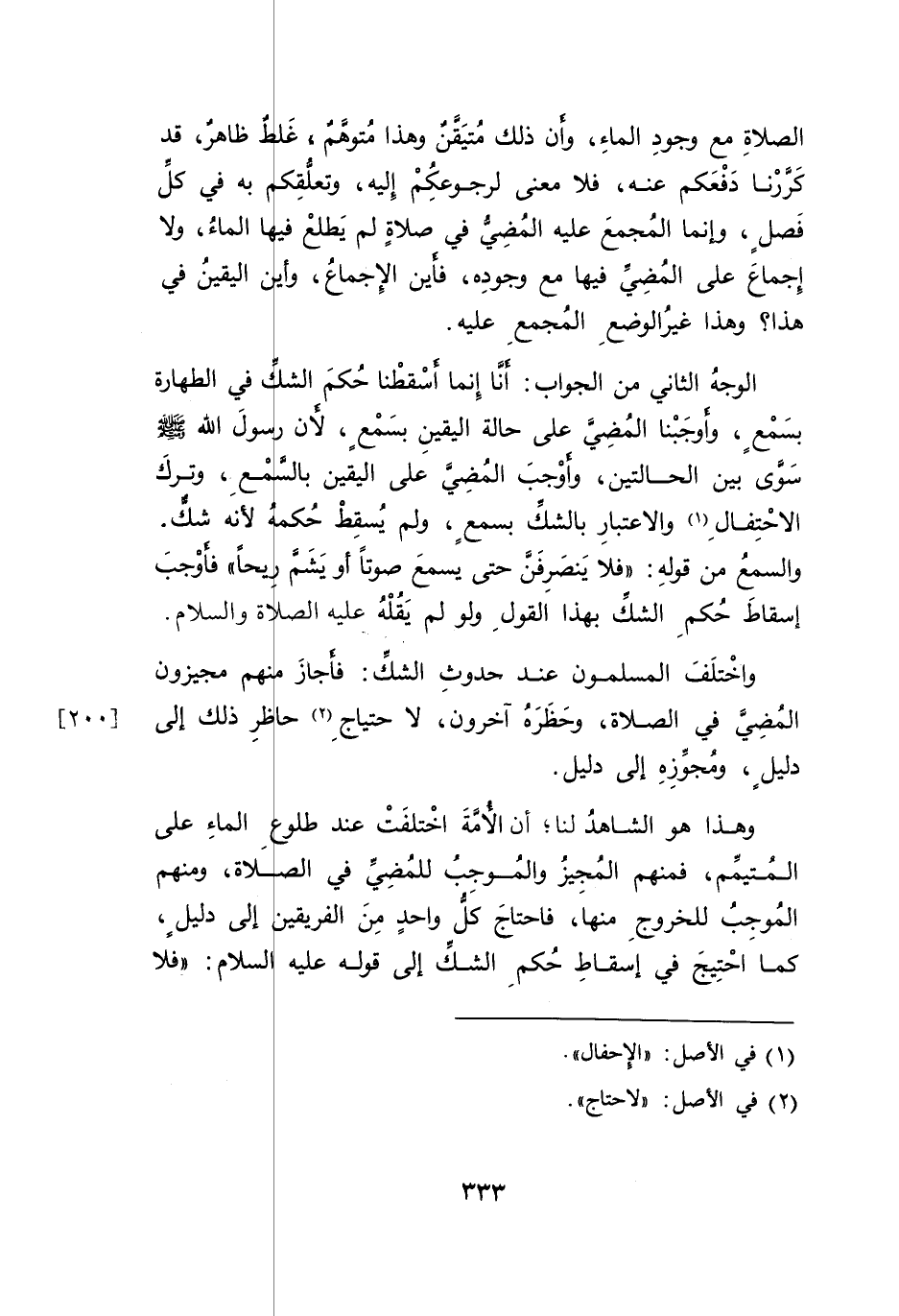 وهذا هو الشاهدُ لنا، أن الأمَّةَ اخْتلفَتْ عند طلوع الماءِ على المُتيمِّم، فمنهم المُجِيزُ والمُوجِبُ للمُضِيِّ في الصلاة، ومنهم المُوجِبُ للخروجِ منها، فاحتاجَ كلُّ واحدٍ مِنَ الفريقين إلى دليلٍ، كما احْتِيجَ في إسقاطِ حُكمِ الشكِّ إلى قوله عليه السلام: "فلا