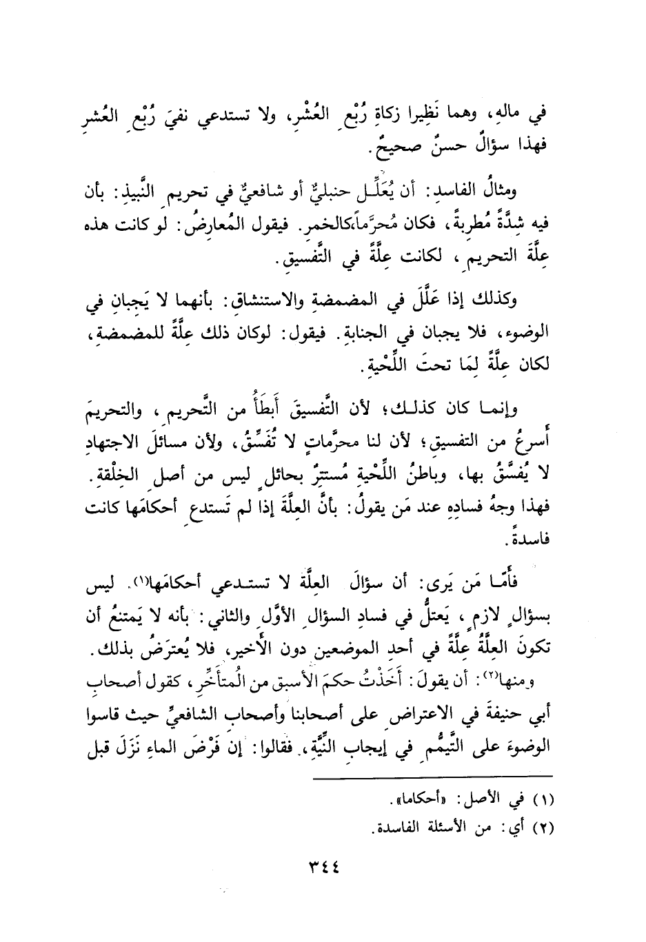 فأمَّا مَن يَرى: أن سؤالَ العِلَة لا تستدعي أحكامَها (١). ليس بسؤال لازم، يَعتل في فسادِ السؤالِ الأولِ والثاني: بأنه لا يَمتنعُ أن تكونَ العِلةُ عِلَّةً في أحدِ الموضعين دون الأخير، فلا يُعترَضُ بذلك.