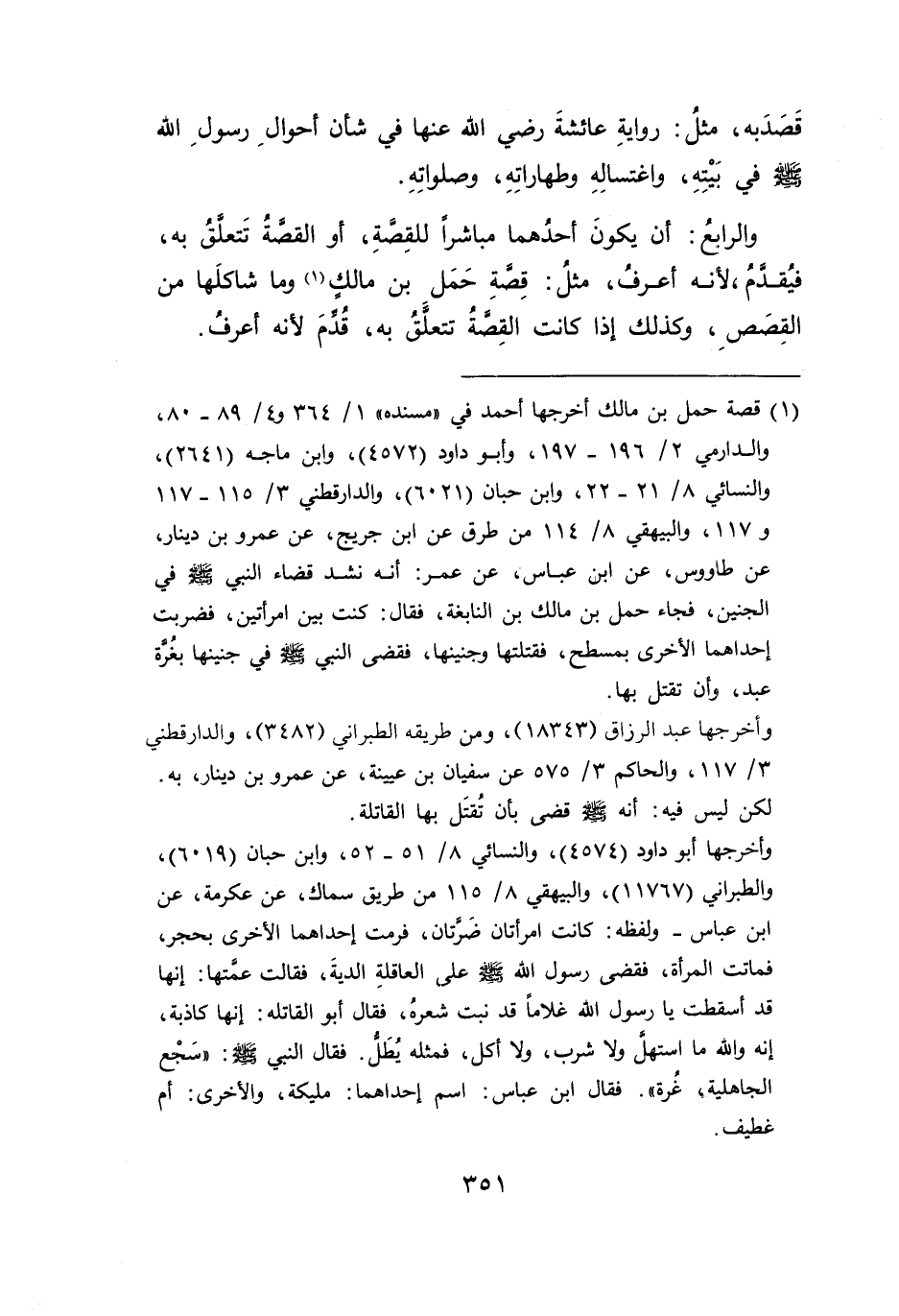 والرابعُ: أن يكونَ أحدُهما مباشراً للقِصَةِ، أو القصةً تَتعلقً به، فيًقدمً، لأنه أعرفُ، مثلُ: قِصةِ حَمَل بن مالكٍ (١) وما شاكلَها من القِصَصِ، وكذلك إذا كانت القِصةُ تتعلقُ به، قُدمَ لأنه أعرفُ.