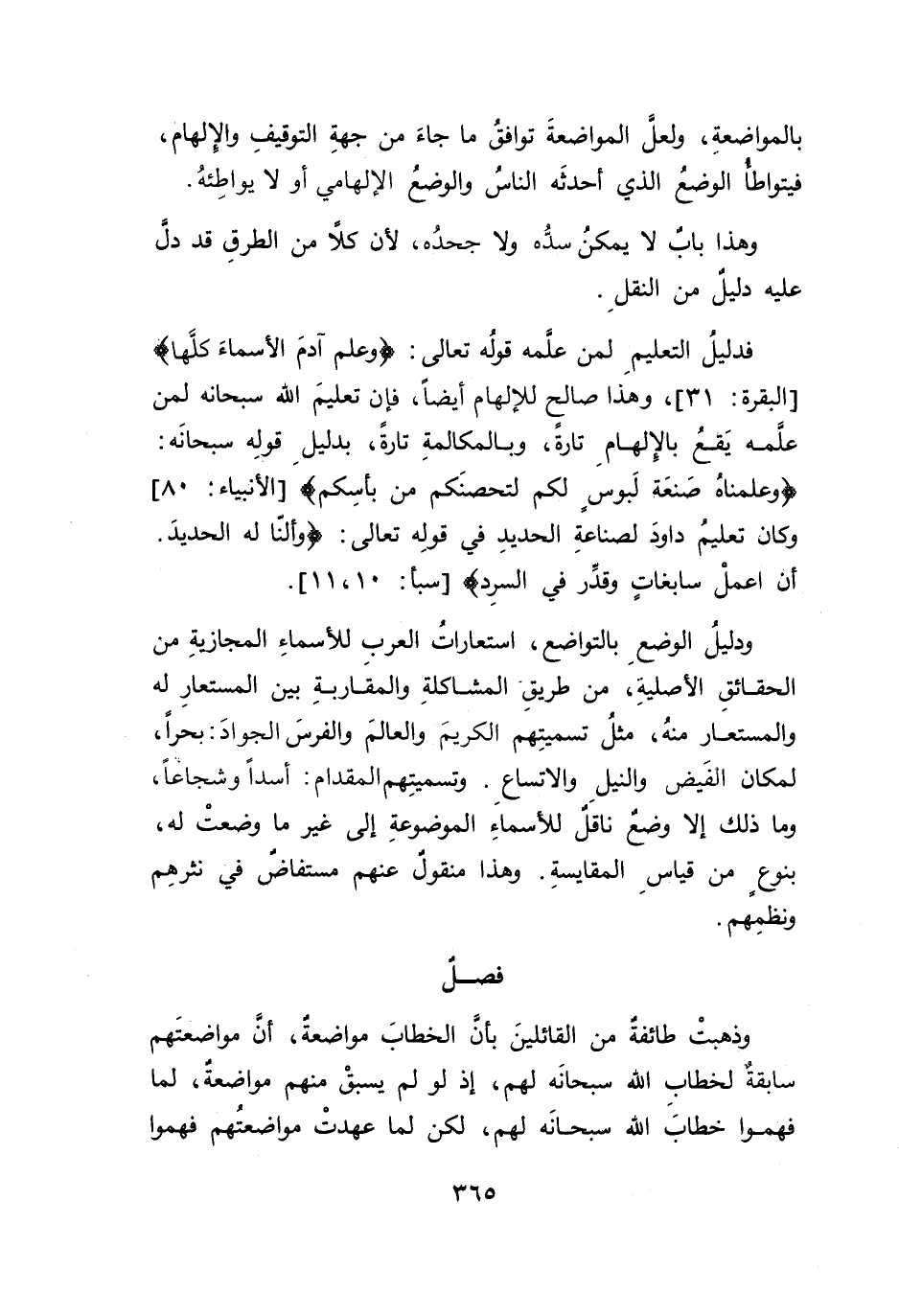 بالمواضعةِ، ولعل المواضعةَ توافقُ ما جاءَ من جهةِ التوقيفِ والِإلهام، فيتواطأ الوضعُ الذي أحدثَه الناسُ والوضعُ الإلهامي أو لا يواطِئهُ.