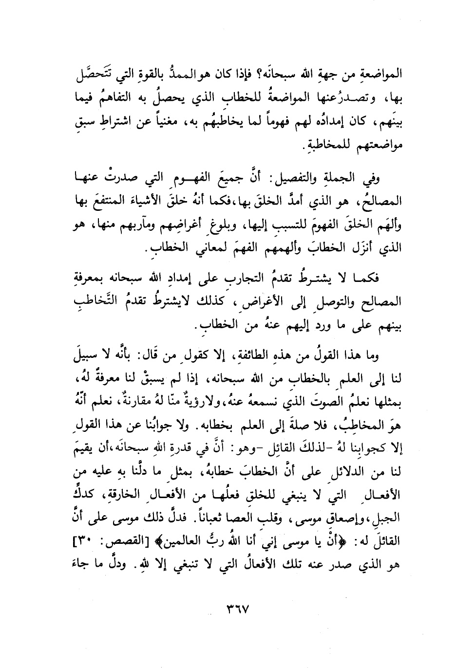 وما هذا القولُ من هذهِ الطائفةِ، إلا كقولِ من قَال: بأنَه لا سبيلَ لنا إلى العلمِ بالخطاب من الله سبحانه، إذا لم يسبقْ لنا معرفة له، بمثلها نعلمُ الصوتَ الذيَ نسمعهُ عنة، ولارؤية منّا لهُ مقارنة، نعلم أنّهُ هوَ المخاطِبُ، فلا صلةَ إلى العلم بخطابه. ولا جوابُنا عن هذا القولِ إلا كجوابِنا لهُ -لذلكَ القائِل- وهو: أن في قدرةِ اللهِ سبحانَه، أن يقيمَ لنا من الدلاْئلِ على أنَ الخطابَ خطابهُ، بمثلِ ما دلنا بهِ عليه من الأفعالِ التي لا ينبغي للخلقِ فعلُها من الأفعالِ الخارقةِ، كدك الجبلِ، وإصعاقِ موسى، وقلب العصا ثعباناً. فدل ذلك موسى على أن القائلَ له: {أَنْ يَا مُوسَى إِنِّي أَنَا اللَّهُ رَبُّ الْعَالَمِينَ} [القصص: ٣٠] هو الذي صدر عنه تلك الأفعالُ التي لا تنبغي إلا لله. ودل ما جاء