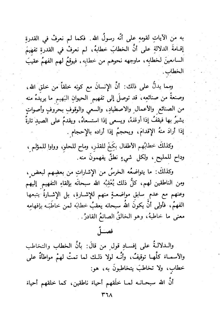 وكذلكَ: ما يتواضعُه الخرسُ من الإِشاراتِ من بعضِهم لبعض، ومن الناطقين لهم، كلُّ ذلك يُعْقِبُه الله سبحانَه بإلقاءِ التفهيمِ إليهم وعنهم مع عدمِ سابقِ مواضعةٍ منهم للإِشارةِ، بل الإشارةْ يتبعها الفهمُ، فأولى أنْ يكونَ اللهُ سبحانه يعقبُ خطابَه لمن خاطَبَه بإفهامِه معنى ما خاطبهُ، وهو الخالقُ الصانعُ القادرُ.