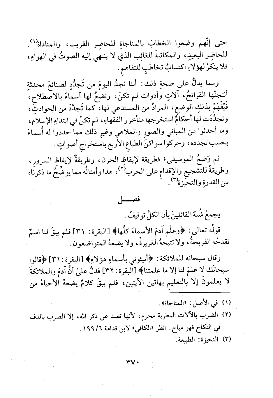 ومما يدلُّ على صحةِ ذلك: أننا نجدُ اليومَ من تجدد لصنائعَ محدثةٍ أِنتجتْها القرائحُ، آلاتٍ وأدوات لم تكنْ، ونضع لها أسماءً بالاصطلاحِ، فيُفْهَمُ بذلكِ الوضع، المرادُ من المستدعي لها، كما تَجددَ من الحوادثِ، وتجددت لها أحكام استخرجها متأخرو الفقهاءِ، لم تكنْ في ابتداءِ الإسلام، وما أحدثوا من المباني والصورِ والملاهي وغيرِ ذلك مما حددوا له أَسماءَ بحسب تجدده، وحركوا سواكنَ الطباعِ الأربع باستخراجِ أصواتٍ.