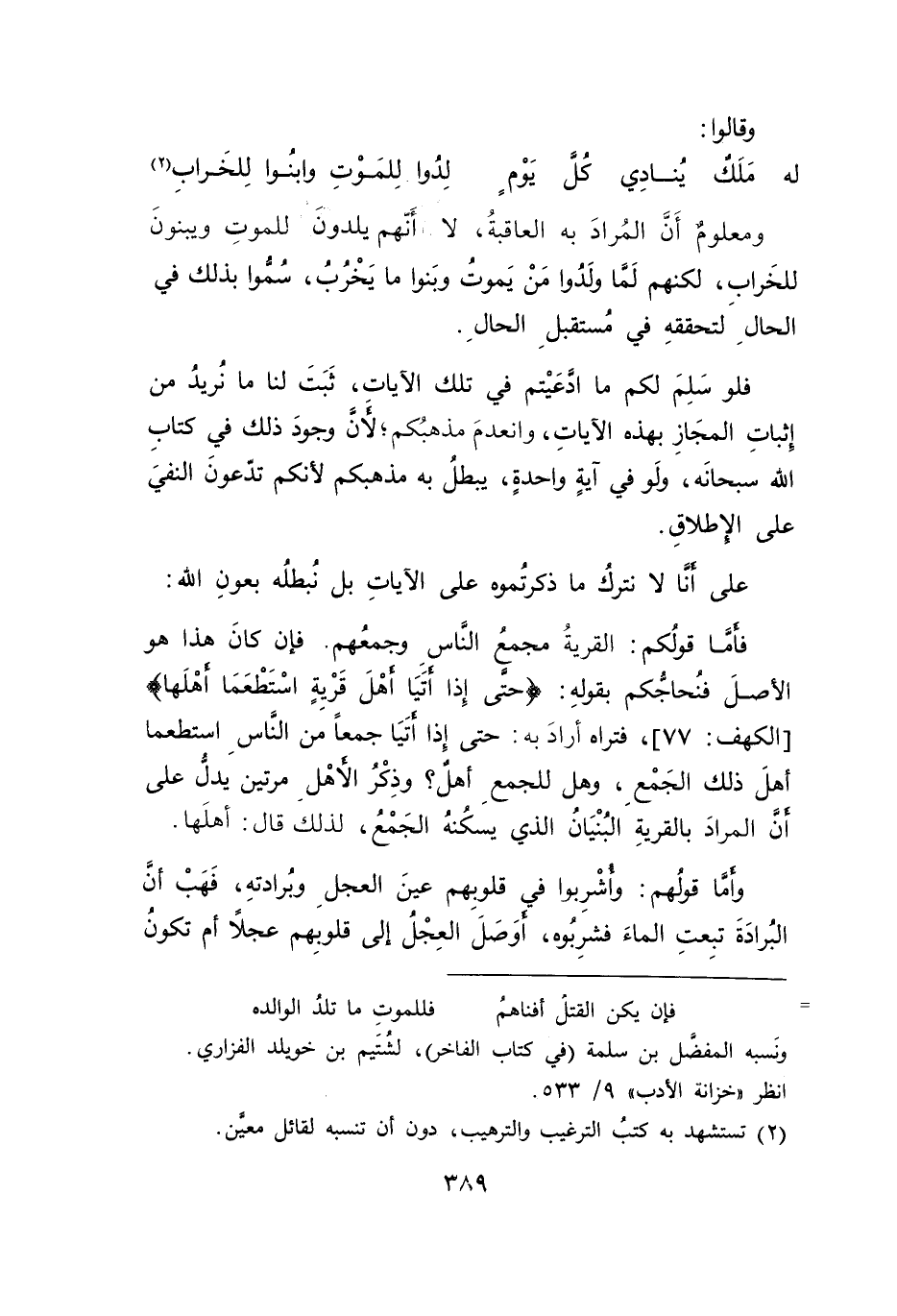 فلو سَلِمَ لكم ما ادعَيْتم في تلك الآيات، ثَبَتَ لنا ما نُريدُ من إِثباتِ المجَار بهذه الآياتِ، وانعدمَ مذهبُكم، لأَنَ وجودَ ذلك في كتاب الله سبحانَه، ولَو في آيةٍ واحدةٍ، يبطلُ به مذهبكم لأنكم تدّعونَ النفيَ على الإطلاقِ.
