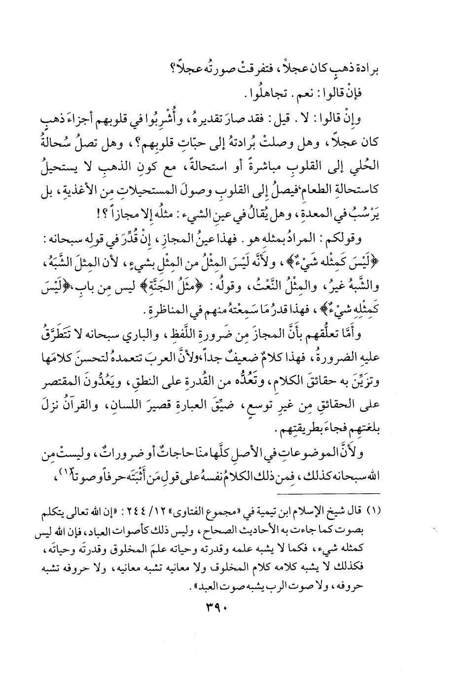 وقولكم: المرادُ بمثلهِ هو. فهذا عينُ المجازِ، إِنْ قُدِّرَ في قولِه سبحانه: {لَيْسَ كَمِثْله شَيْءٌ} ولأَنَّه لَيْسَ المِثْلُ من المِثْلِ بشيءٍ، لأن المِثلَ الشَّبَهُ، والشَّبهُ غيرُ، والمِثْلُ النَّعْتُ، وقولُه: {مثَلُ الجَنَّةِ} ليس مِن بابِ، {لَيْسَ كَمِثْلِهِ شيْءٌ}، فهذا قدرُ مَا سَمِعْتهُ منهم في المناظرةِ.
