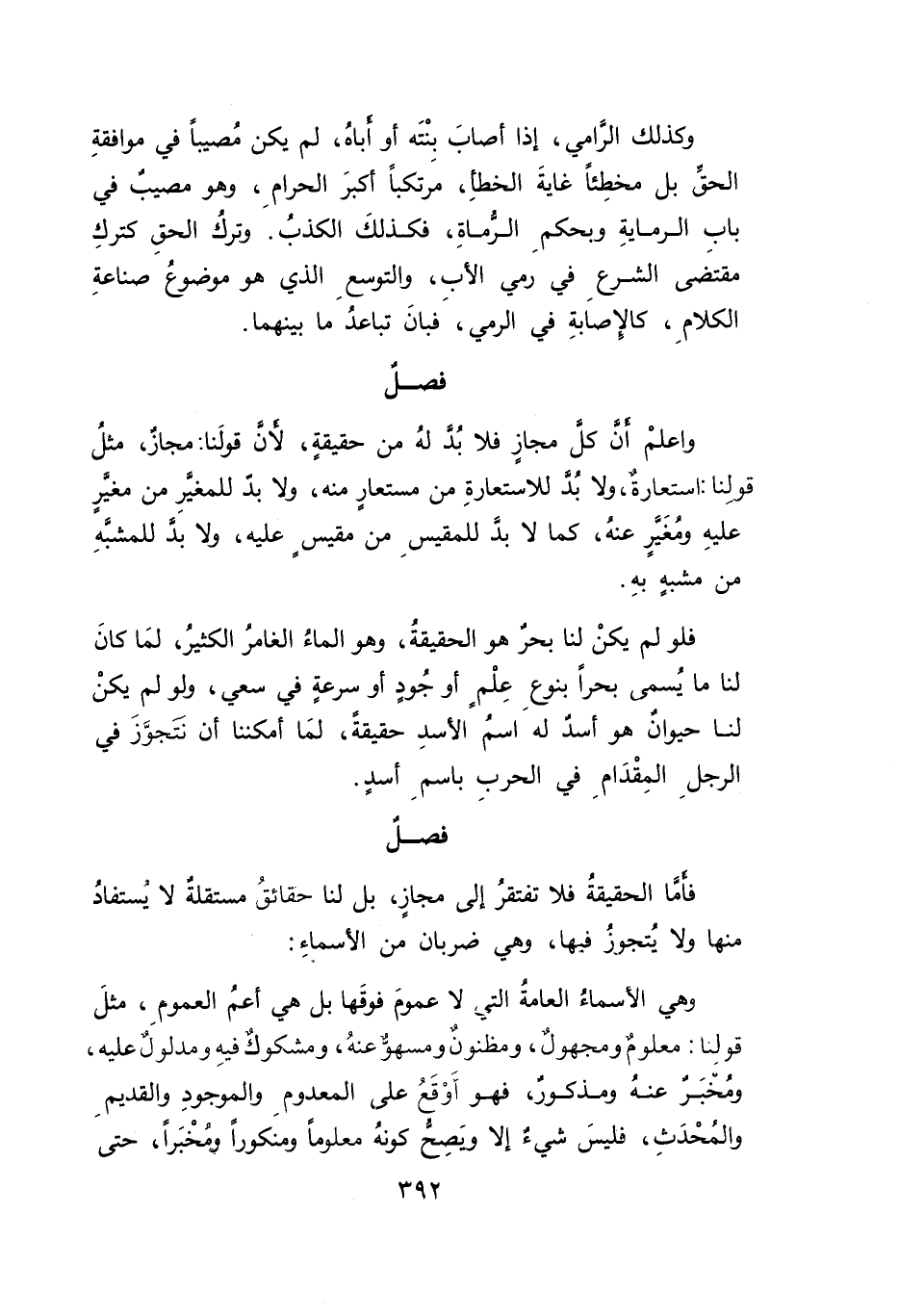 فلو لم يكنْ لنا بحر هو الحقيقةُ، وهو الماءُ الغامرُ الكثيرُ، لمَا كانَ لنا ما يُسمى بحراً بنوعِ عِلْمٍ أوجُودٍ أو سرعةٍ في سعي، ولو لم يكنْ لنا حيوانٌ هو أسد له اسمُ الأسدِ حقيقةً، لمَا أمكننا أن نتَجوَّزَ في الرجلِ المِقْدَامِ في الحربِ باسمِ أسدٍ.