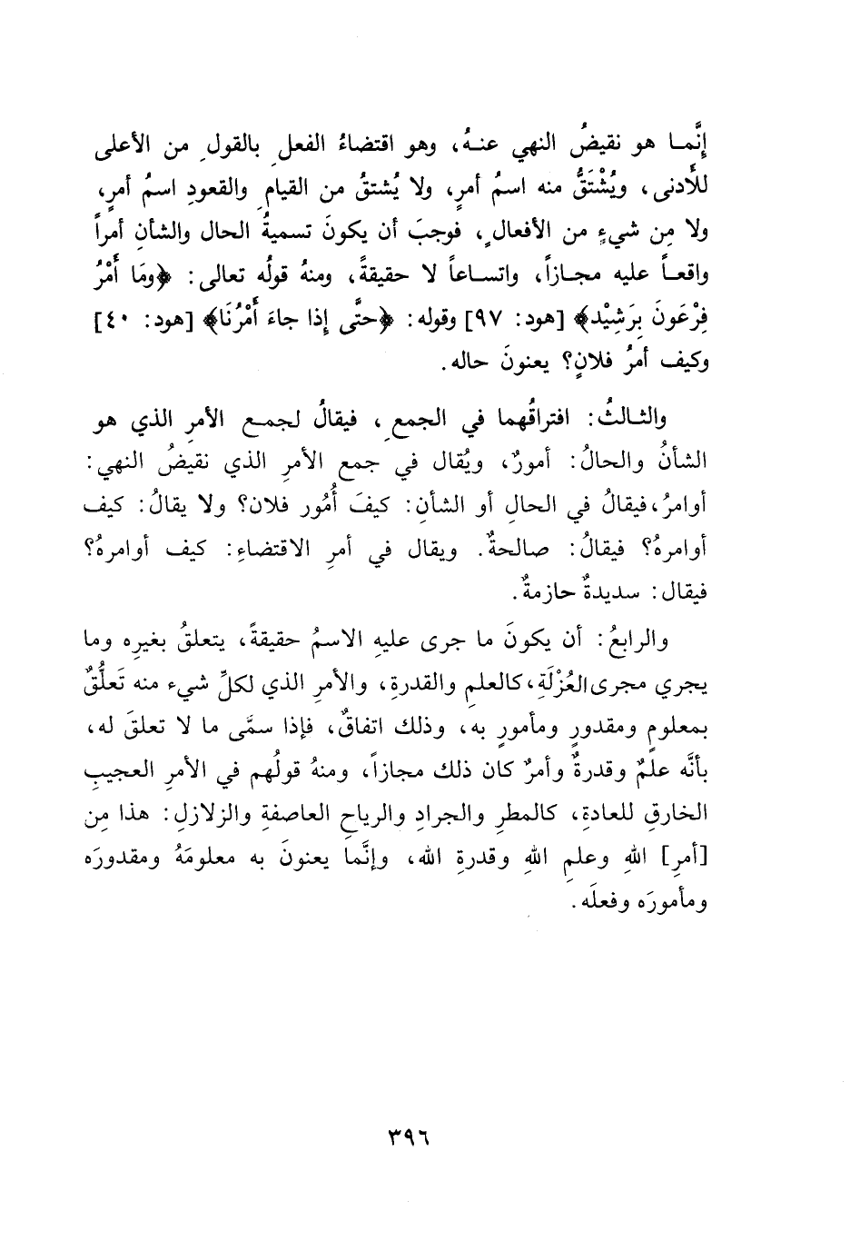 إنَّما هو نقيضُ النهي عنهُ، وهو اقتضاءُ الفعلِ بالقولِ من الأعلى للأدنى، وُيشْتَقُّ منه اسمُ أمرٍ، ولا يُشتقُ من القيام والقعودِ اسمُ أمرٍ، ولا مِن شيء من الأفعال، فوجبَ أن يكونَ تسمية الحال والشأنِ أمراً واقعاً عليه مجازاً، واتساعاً لا حقيقةً، ومنهُ قولُه تعالى: {وَمَا أَمْرُ فِرْعَوْنَ بِرَشِيدٍ} [هود: ٩٧] وقوله: {حَتَّى إِذَا جَاءَ أَمْرُنَا} [هود: ٤٠] وكيف أمَرُ فلانٍ؟ يعنونَ حاله.